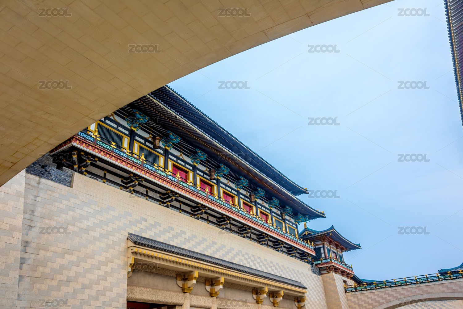 西安夕阳下雄伟壮观震撼的唐式宫廷木制建筑楼阁