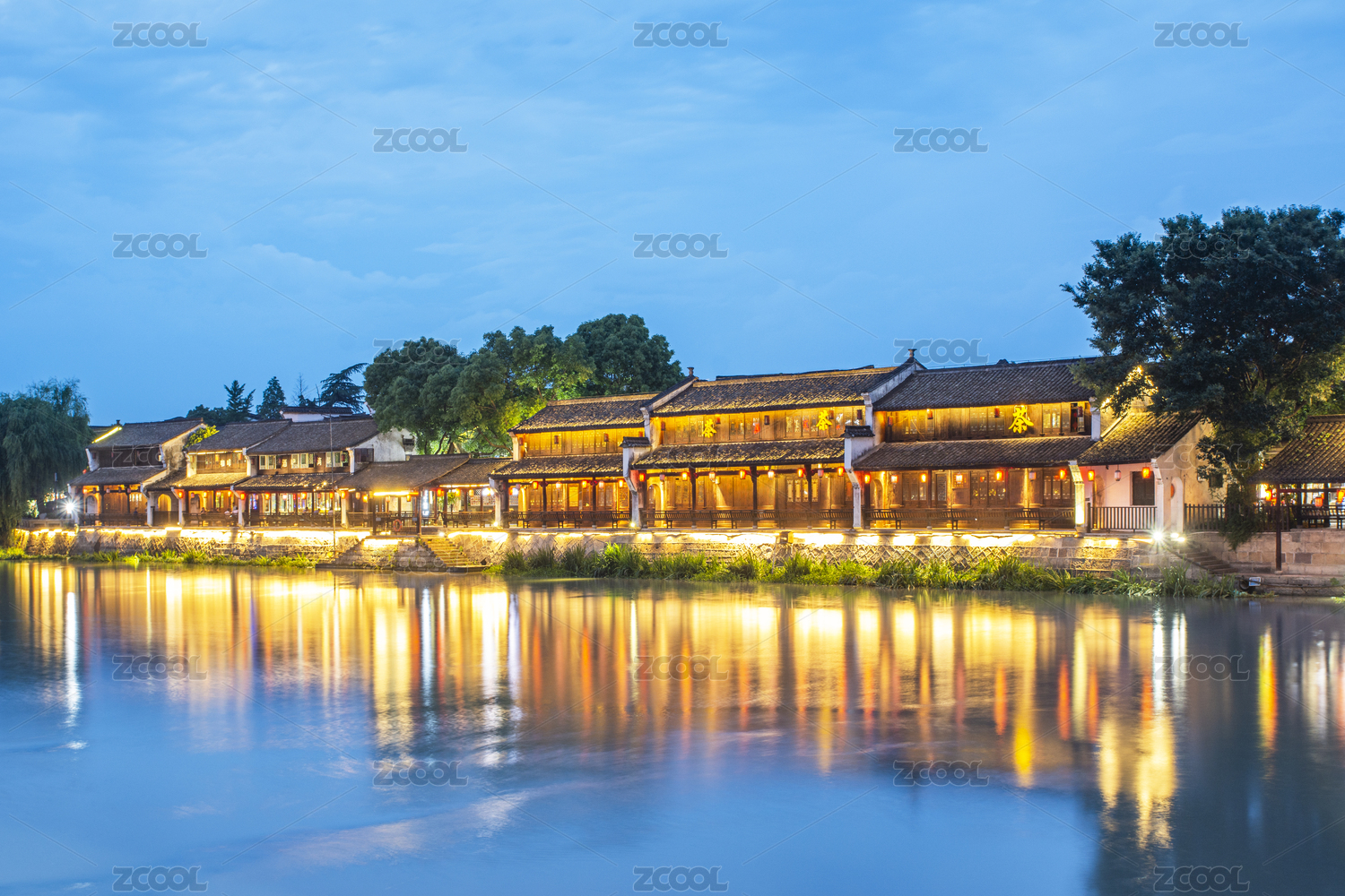 中国浙江杭州西塘古镇河面倒影映衬古朴建筑夜景