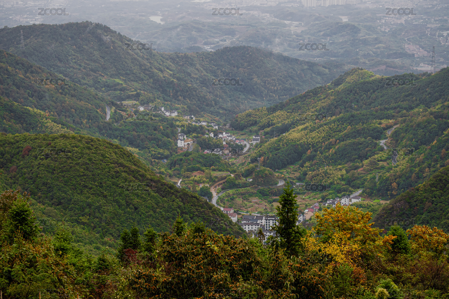 中国安徽省的大洲源景区的高山峡谷和美丽村