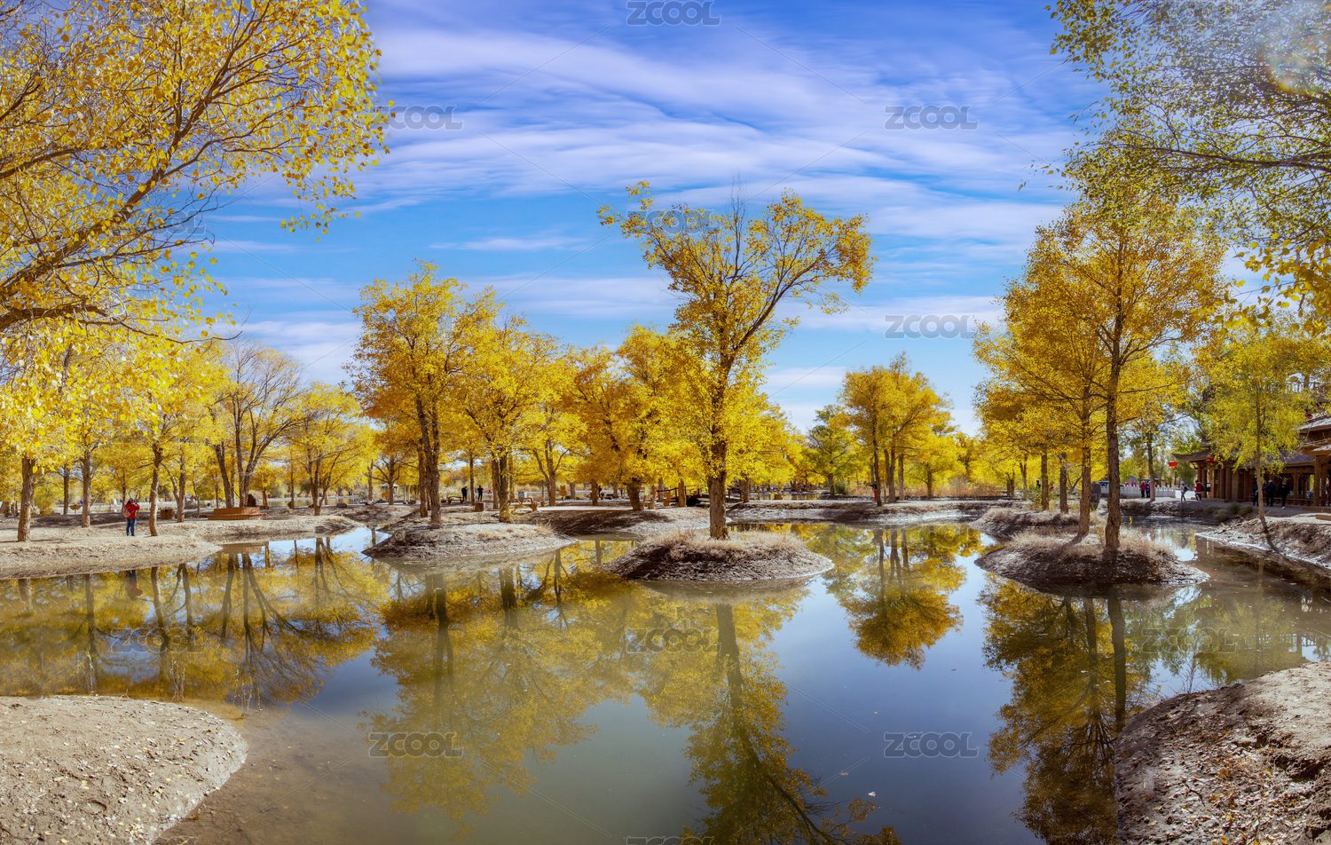 中国甘肃金塔蓝天白云胡杨林水面光影