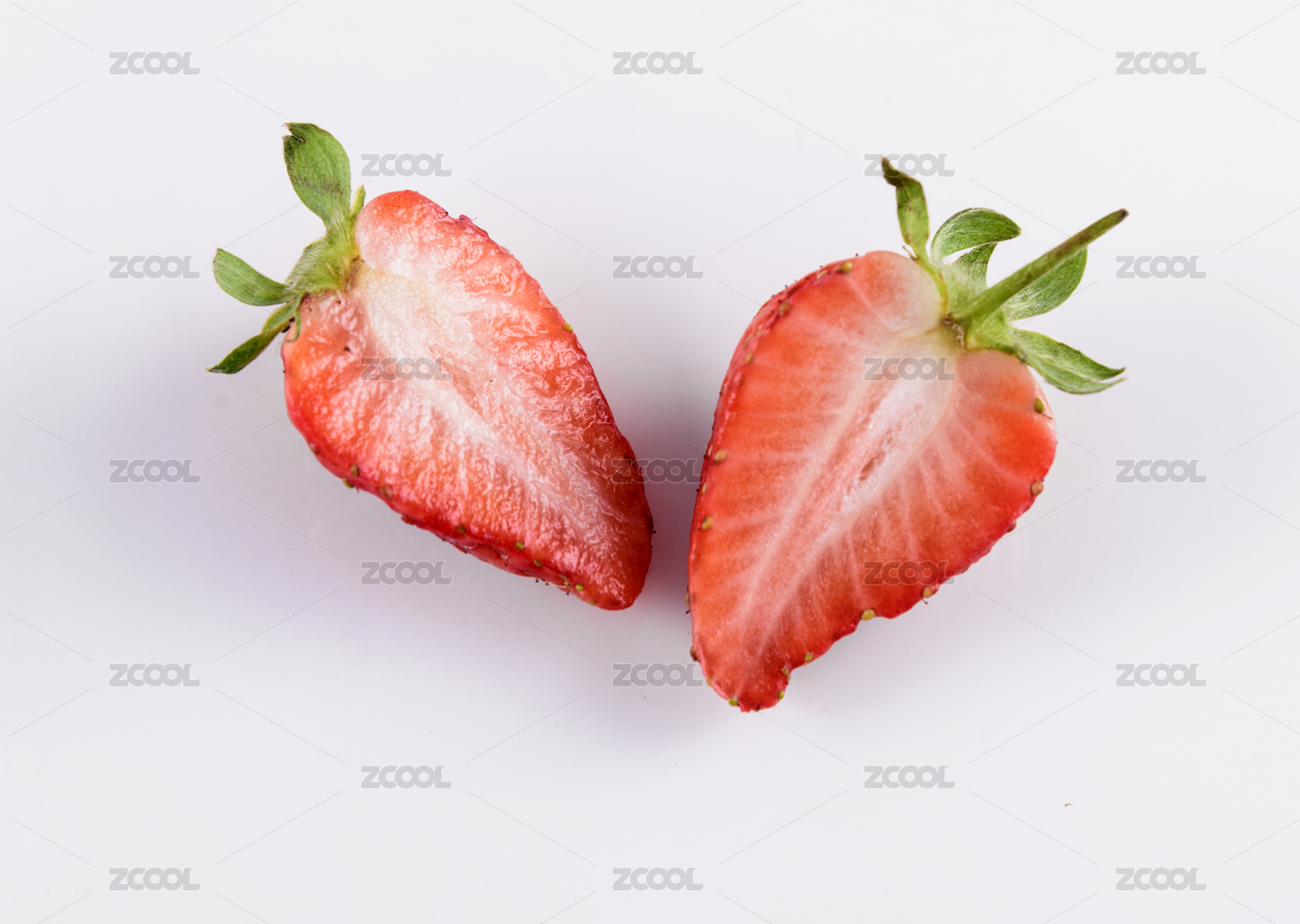 白色桌面上放着几颗切开的带着绿叶的草莓