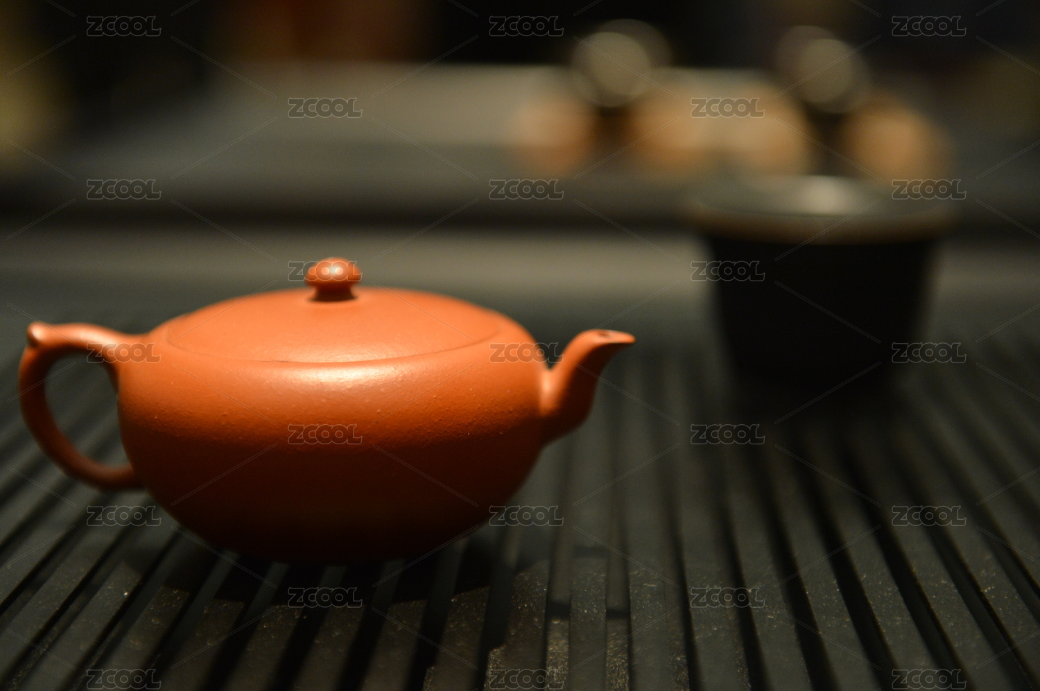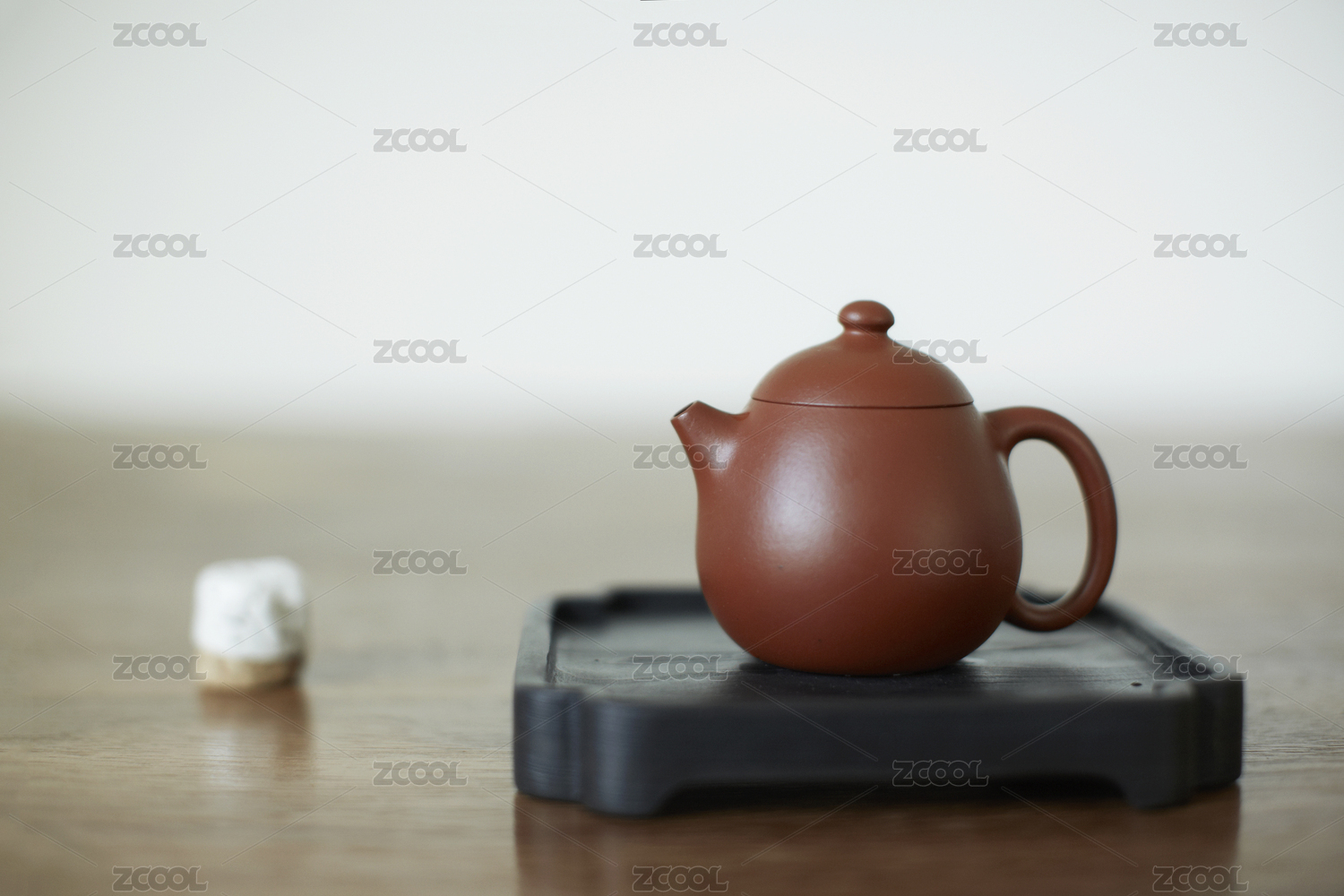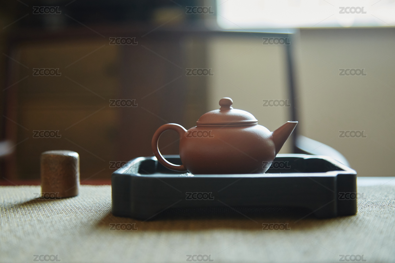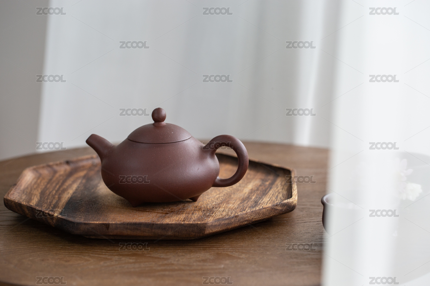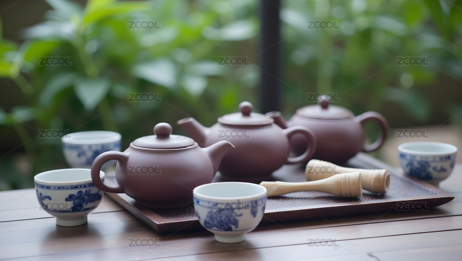 放在木桌上的紫砂茶壶和茶具,复古的氛围
