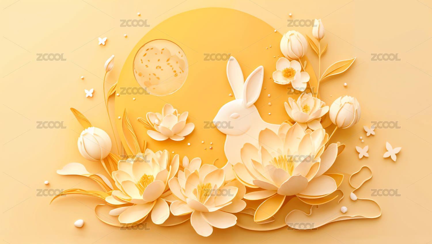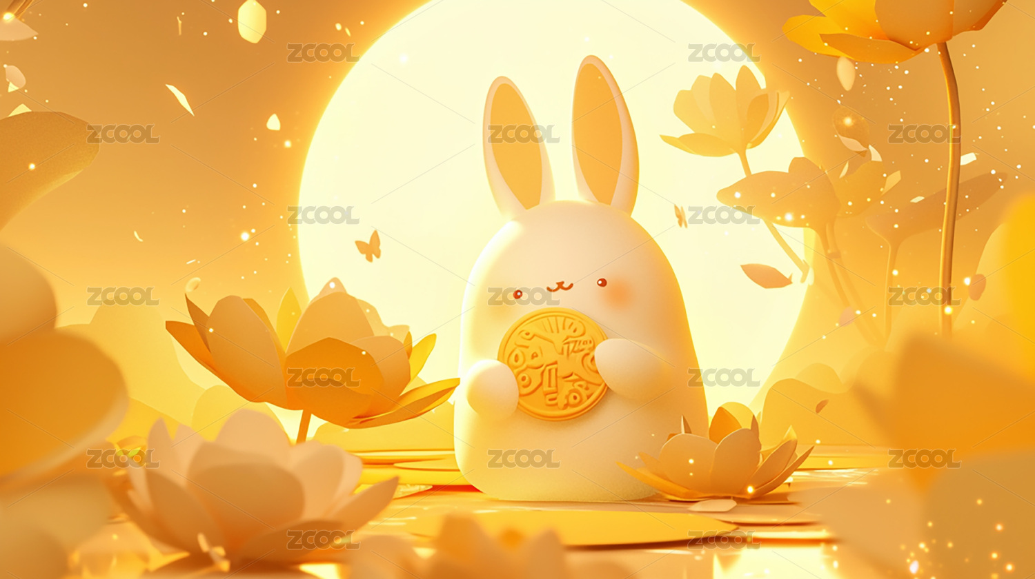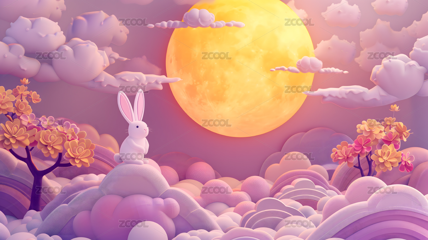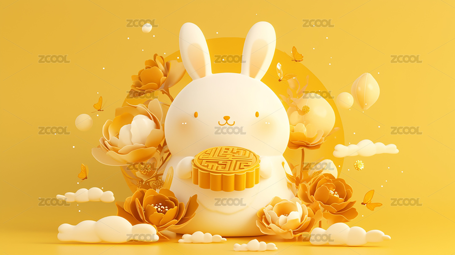 兔子,月饼,可爱,云朵,花朵,黄色,童真,温暖,中秋节,3D