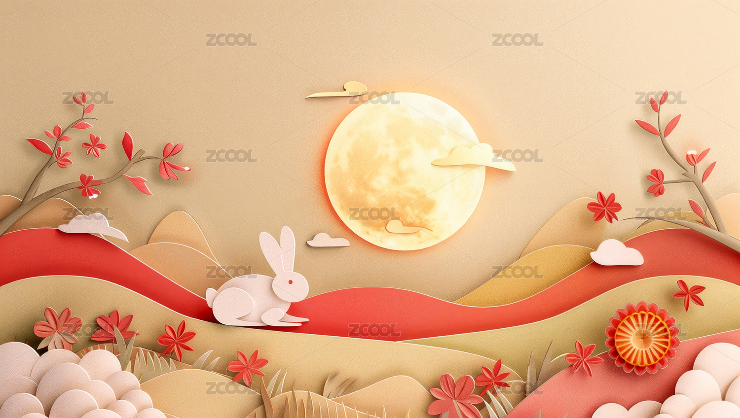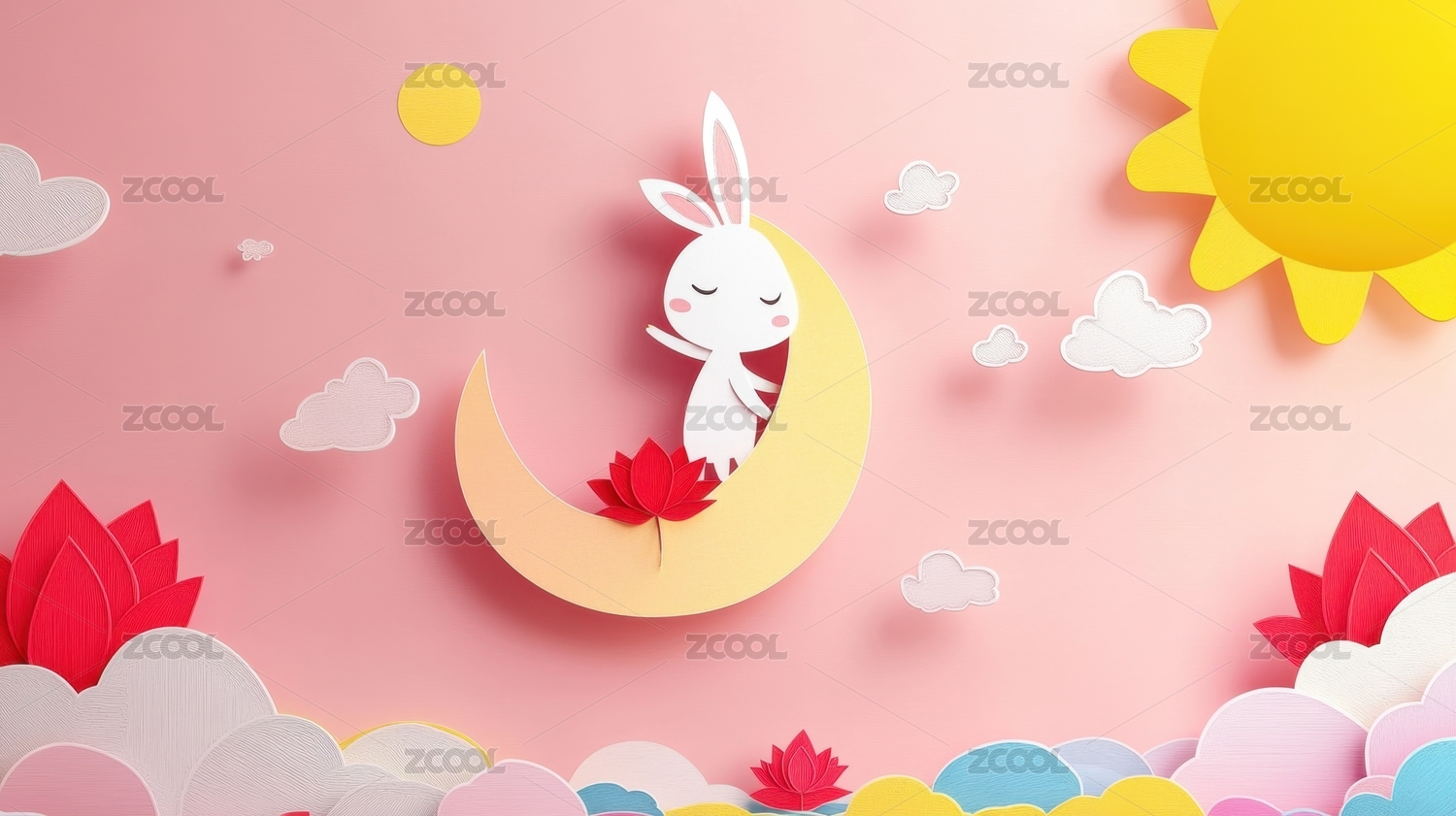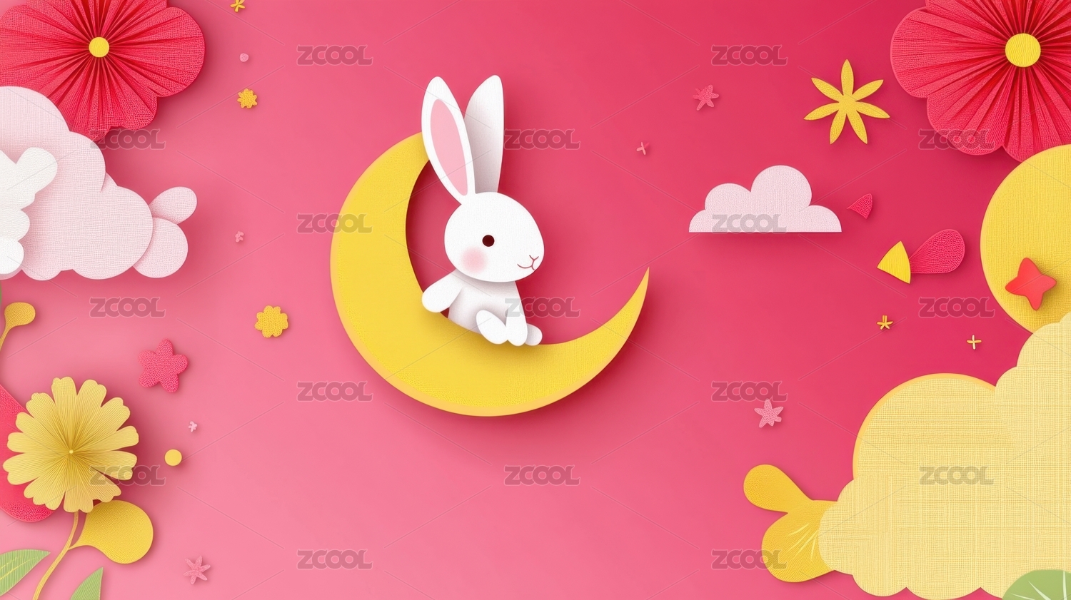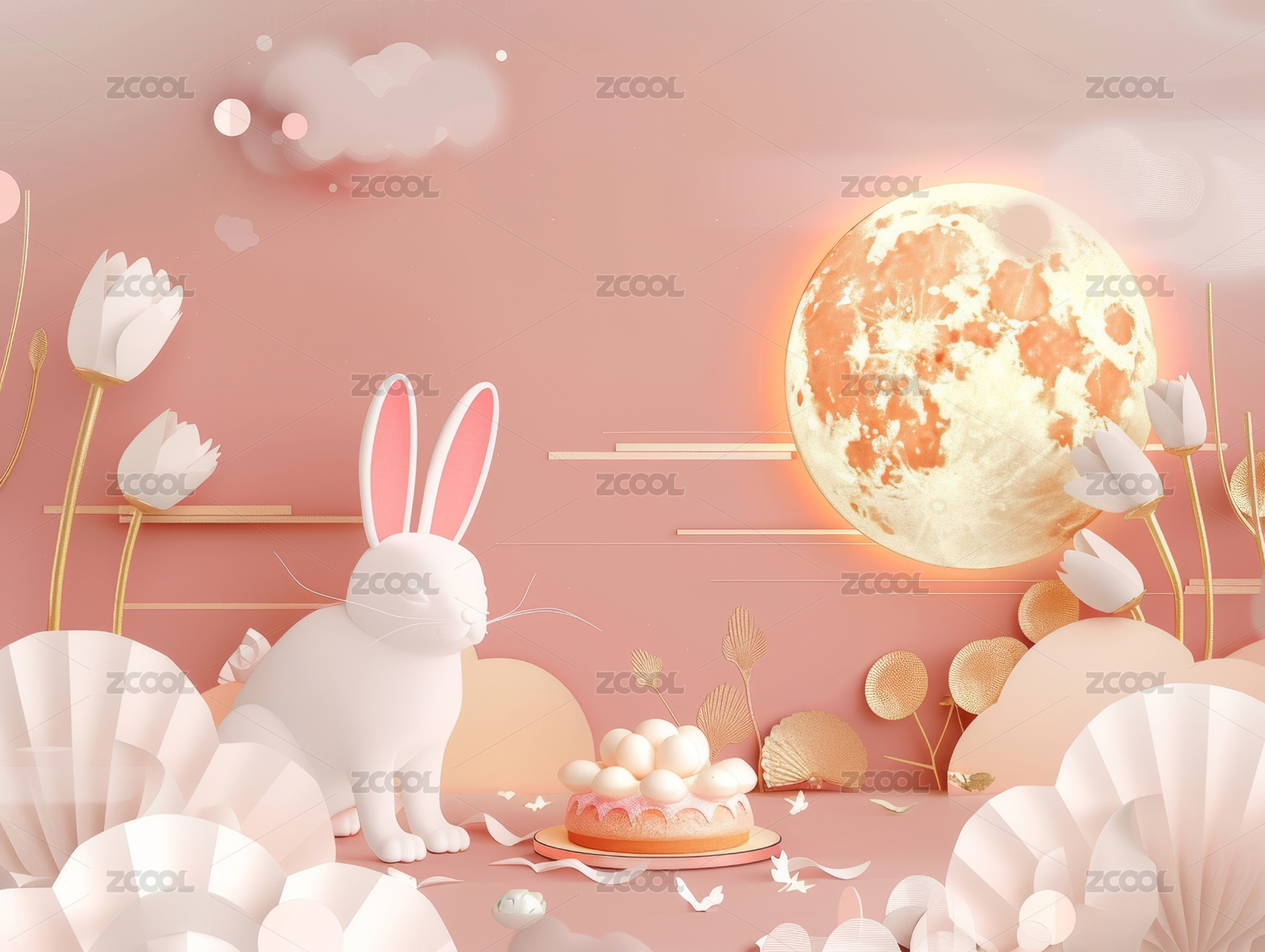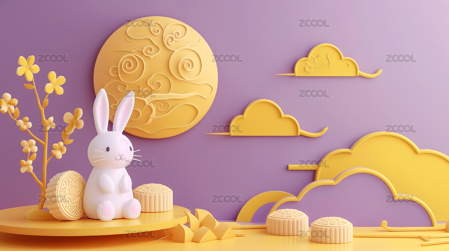 兔子,月饼,可爱,云朵,花朵,黄色,童真,温暖,中秋节,3D