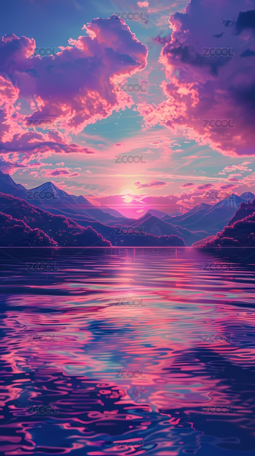 山和湖风景插画抽象艺术装饰画手机端海背景