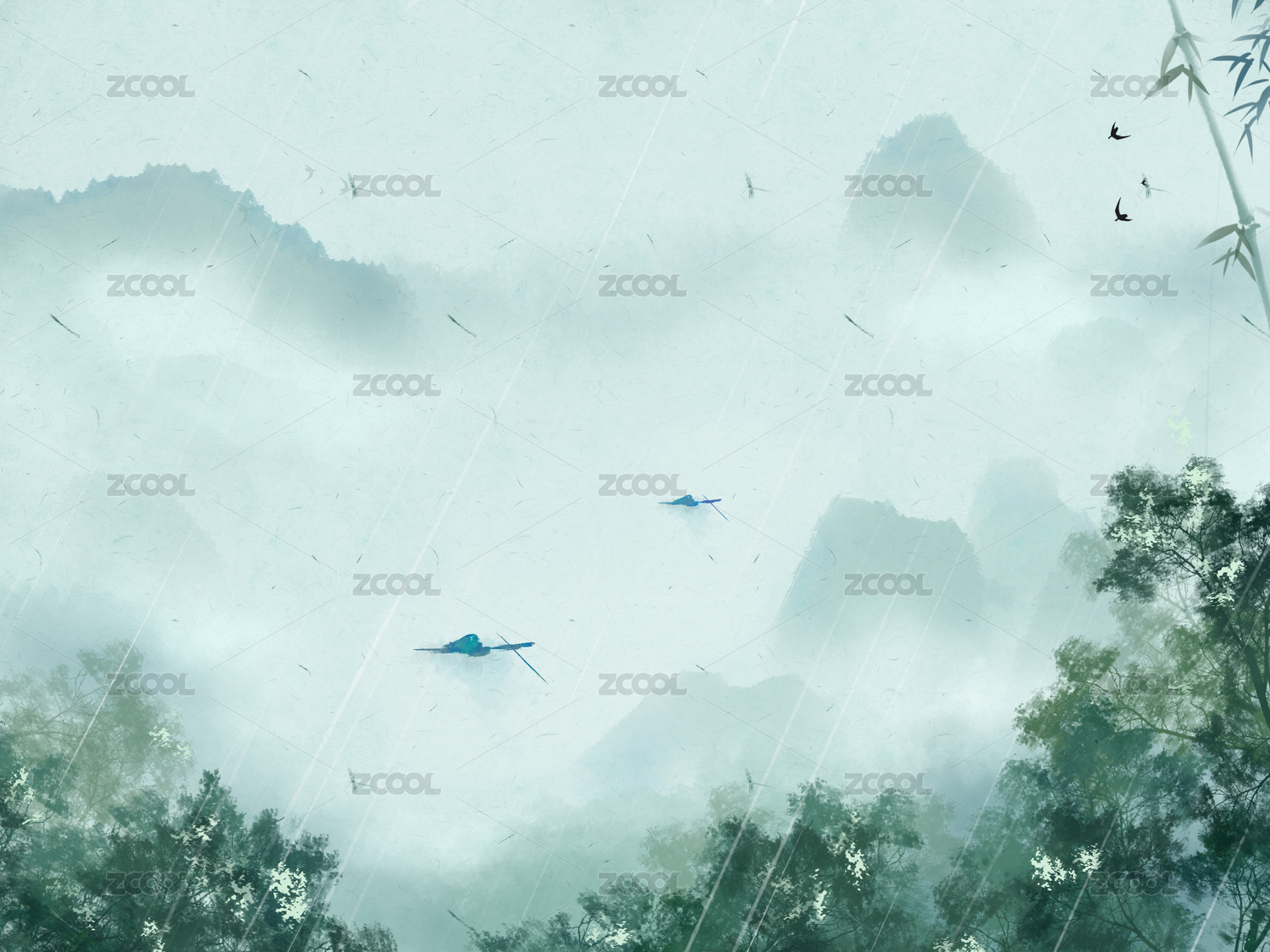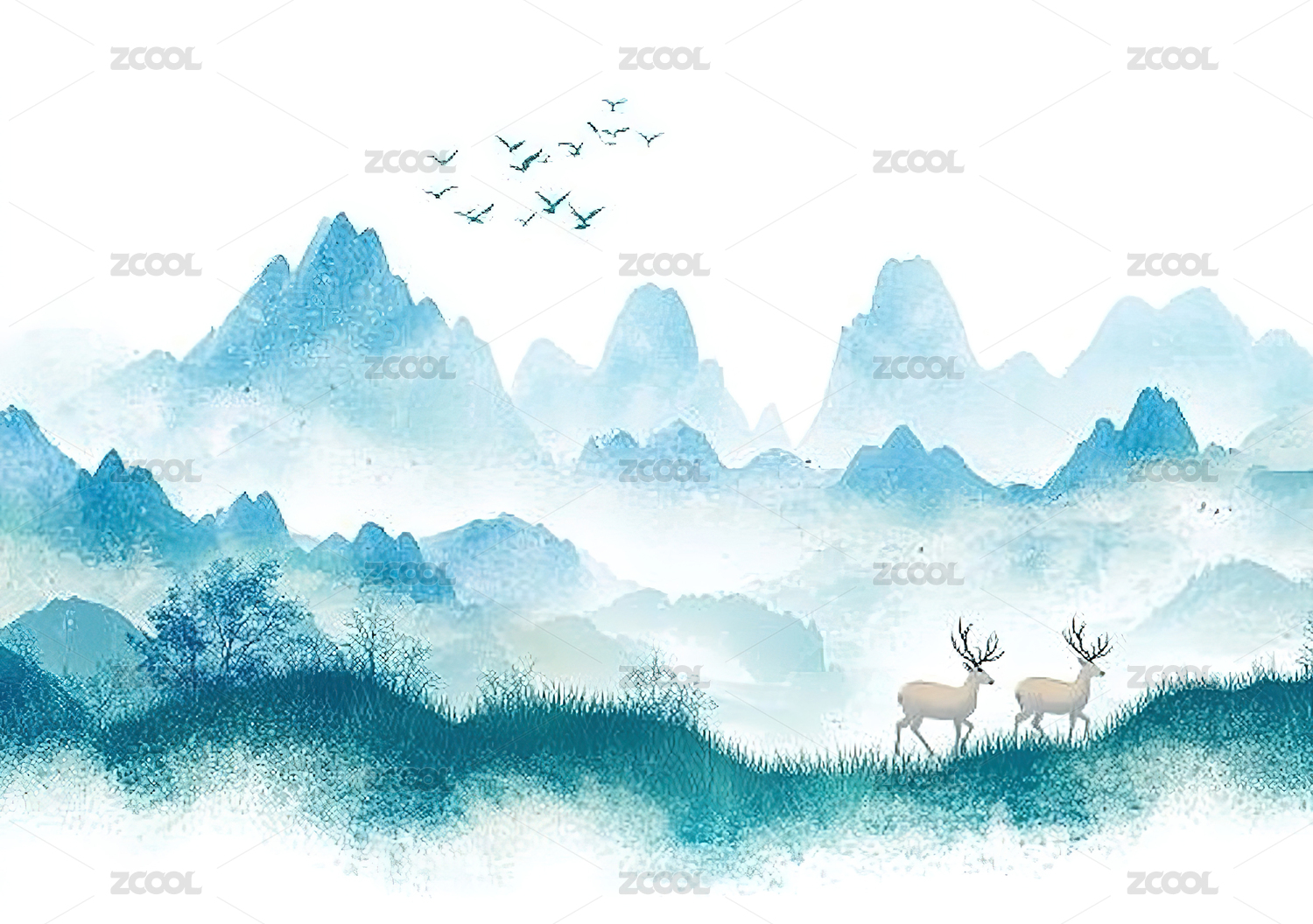 中国,国风,中式,山水,山间,插画,草地,树木,鹿,水墨