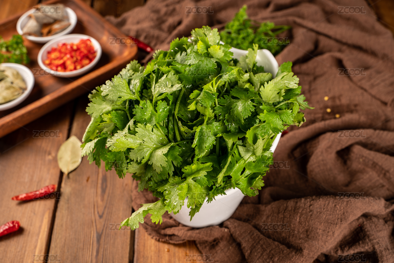 木板背景上一盘新鲜香菜