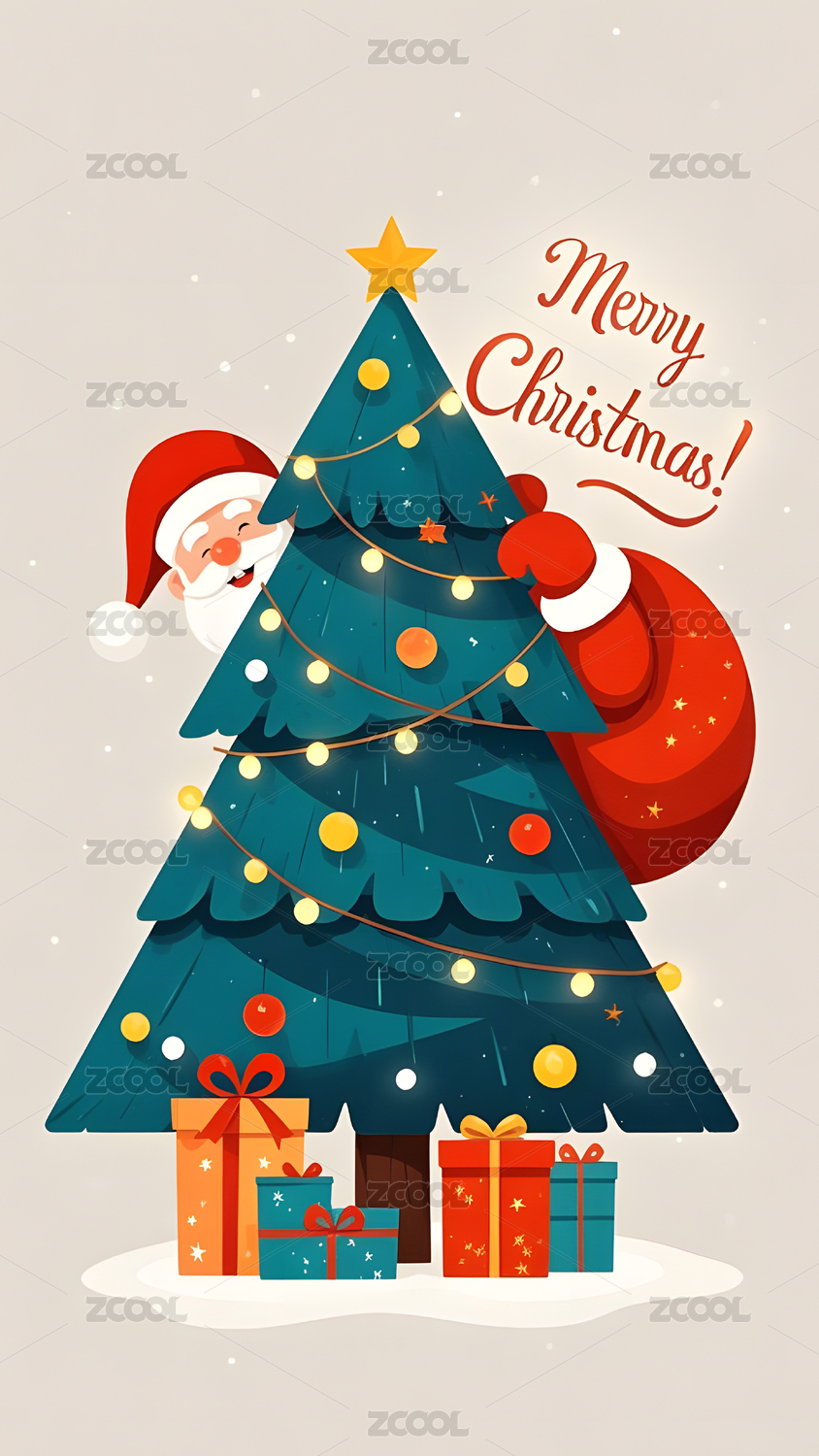 圣诞节插画圣诞树后圣诞老人雪人驯鹿祝福
