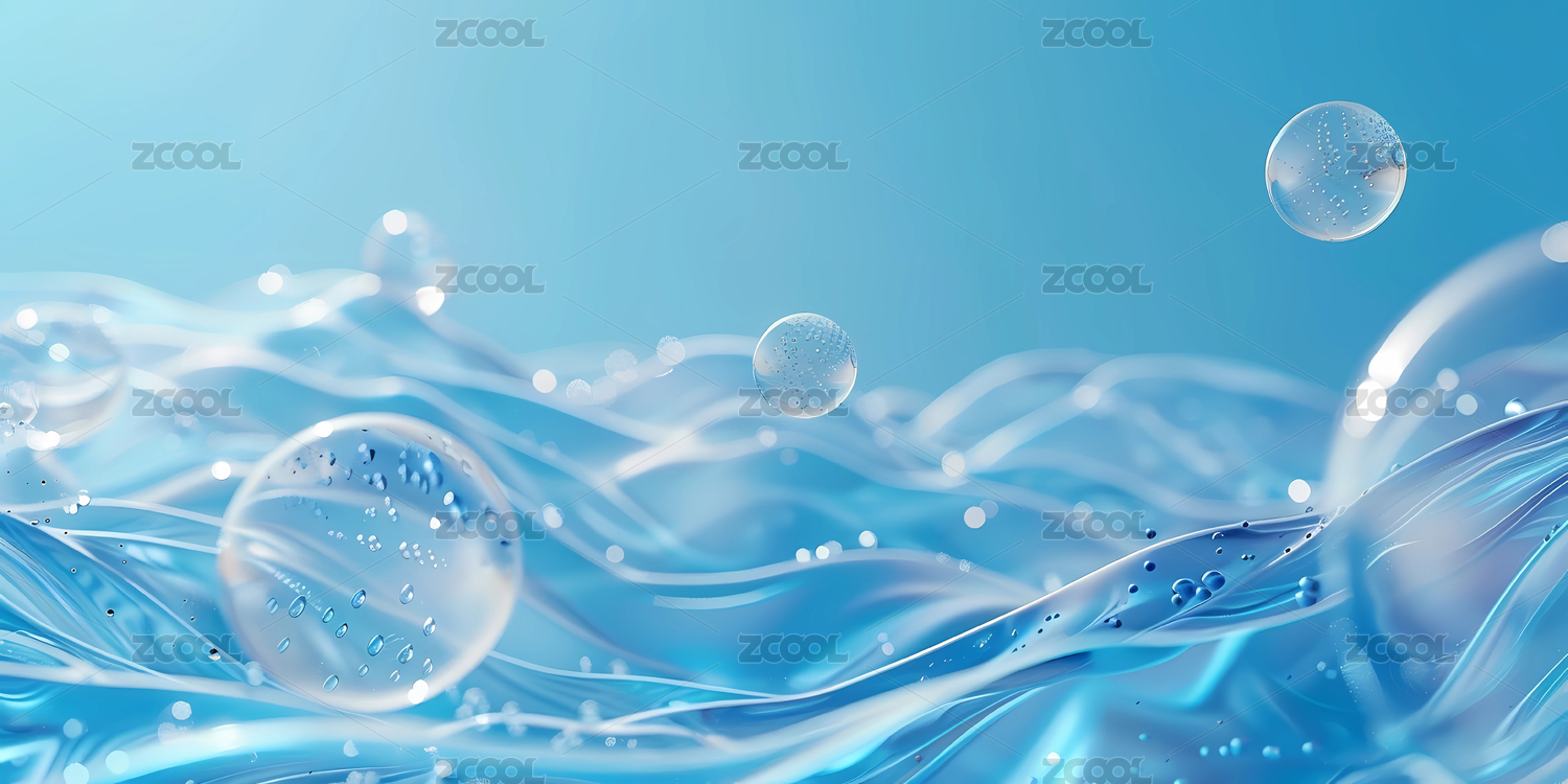 3D渲染蓝色气泡与波浪水波纹蓝色背景