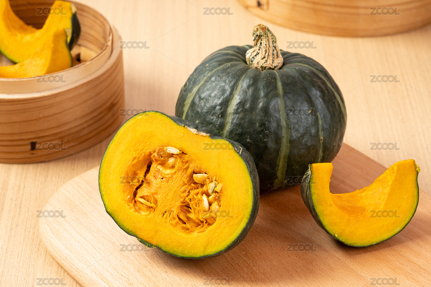 桌子上切开放在砧板上的新鲜贝贝小南瓜