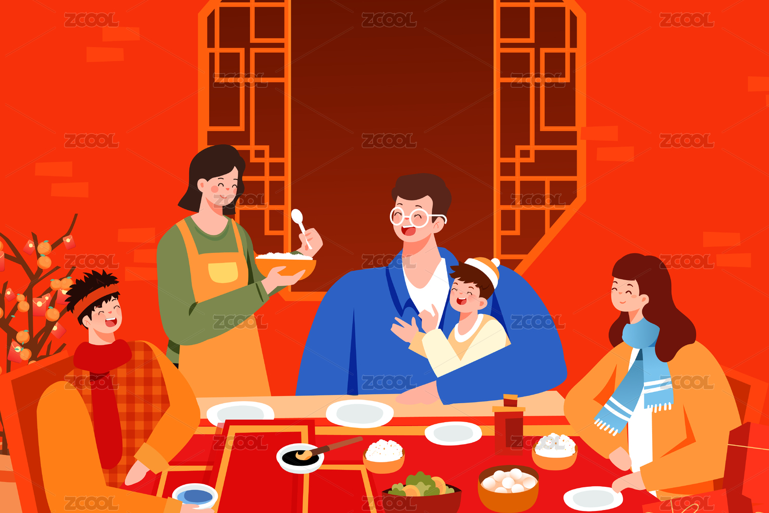 2020鼠年春节年夜饭团圆背景矢量插画