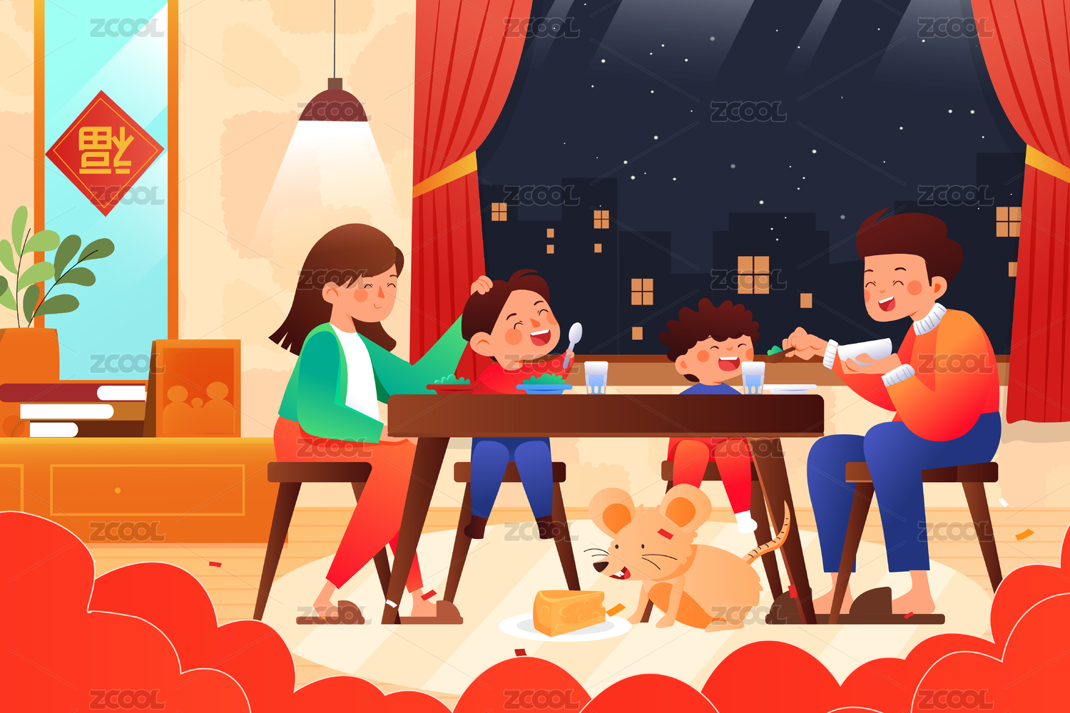 2020鼠年春节年夜饭团圆背景矢量插画