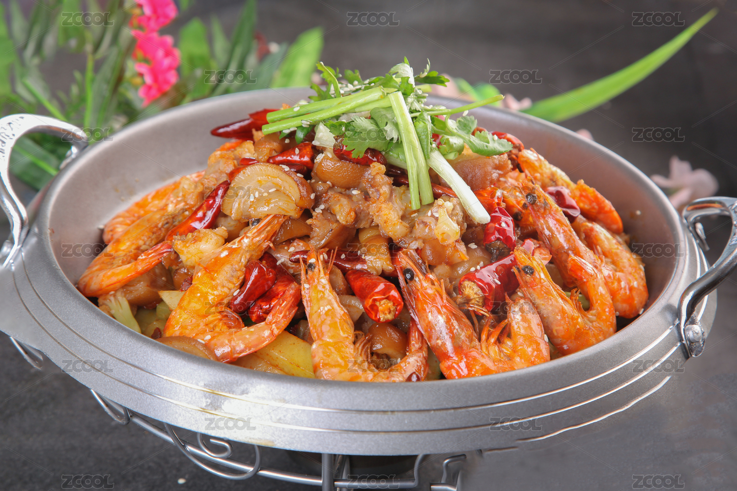 木桌上平底耳底里的麻辣干锅大虾牛蛙鸡爪