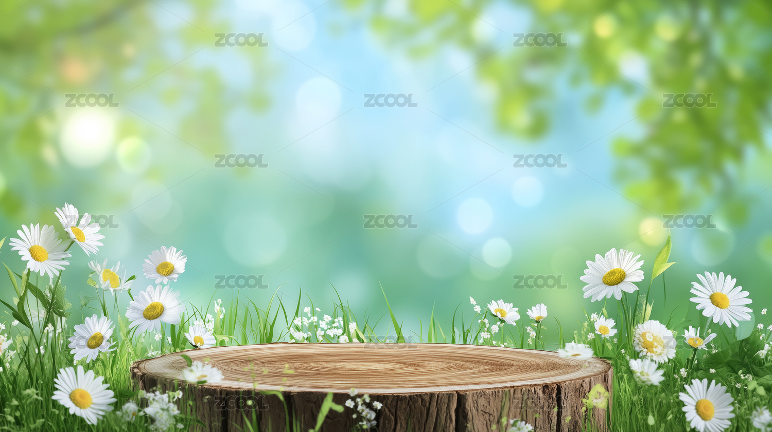 草地花朵天空树木木质底座产品展台背景
