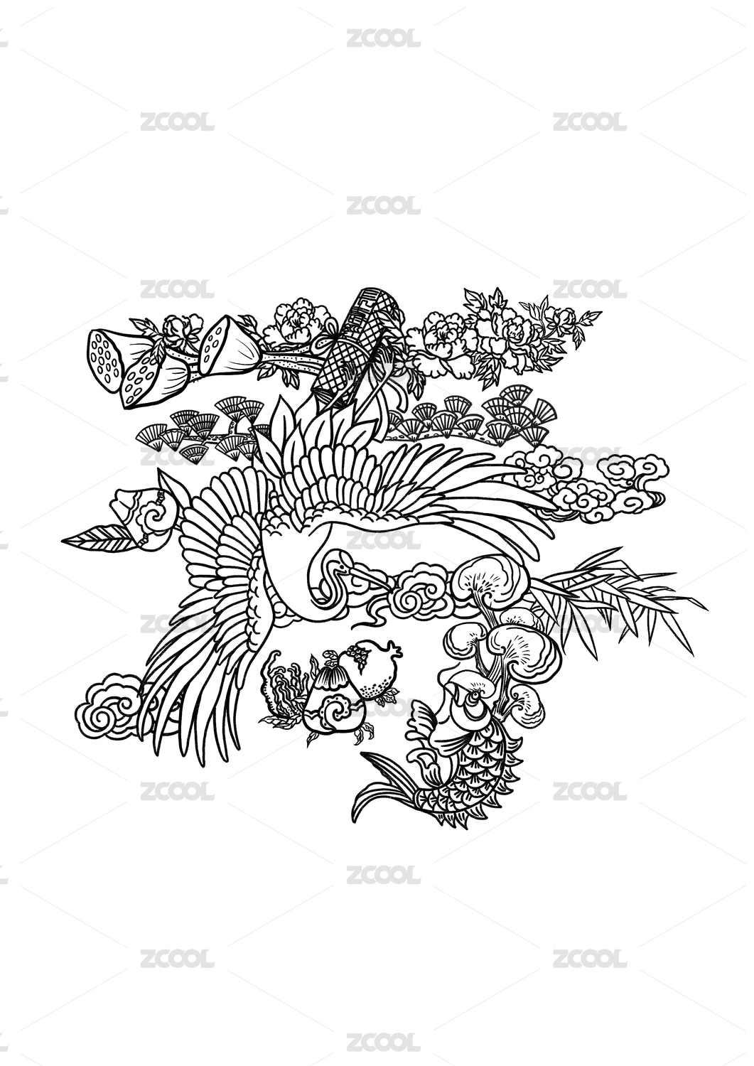 手绘黑白花鸟孔雀喜雀鸳鸯祥云百鸟朝凤图