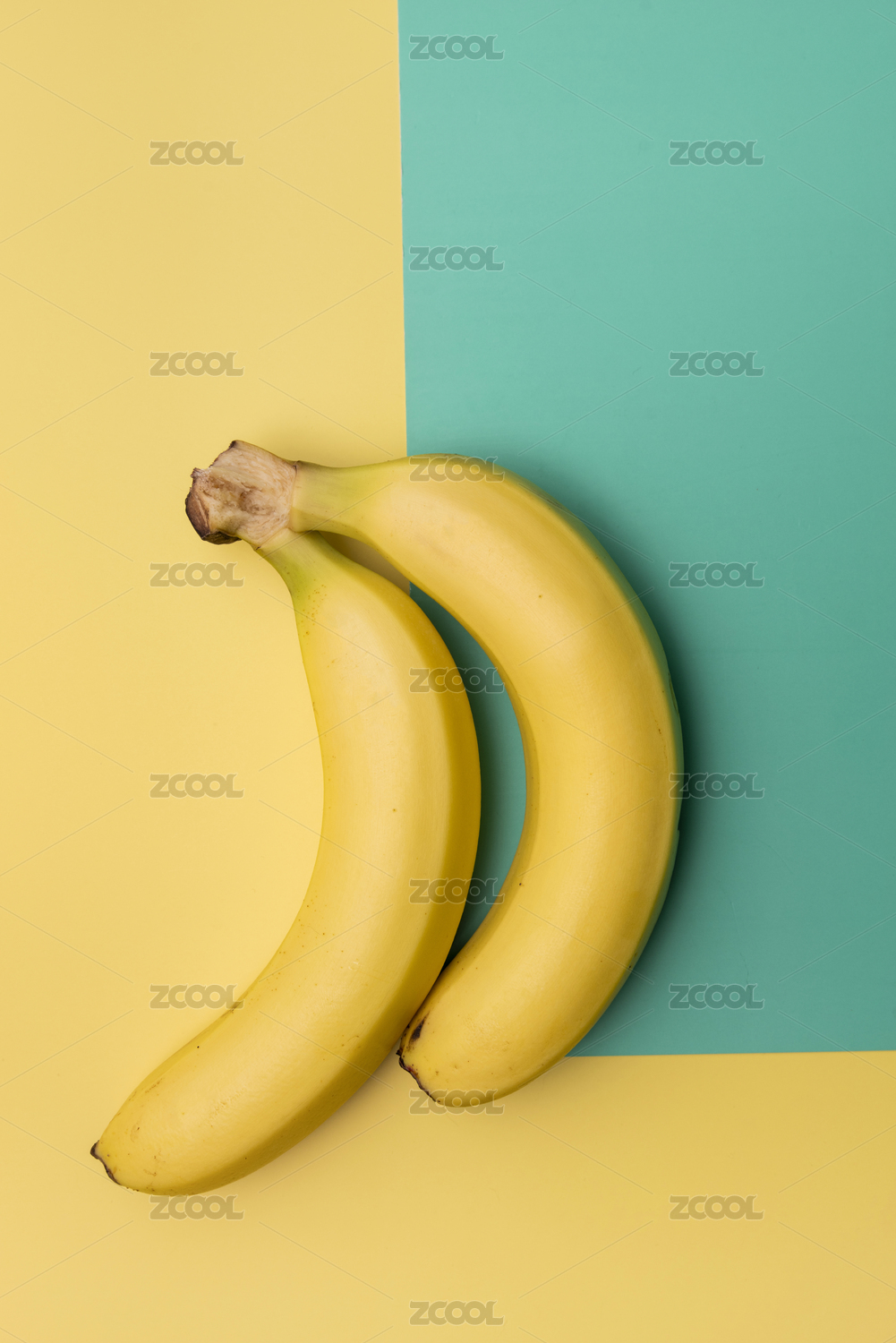 俯拍黄色绿色撞色背景水果特写——香蕉
