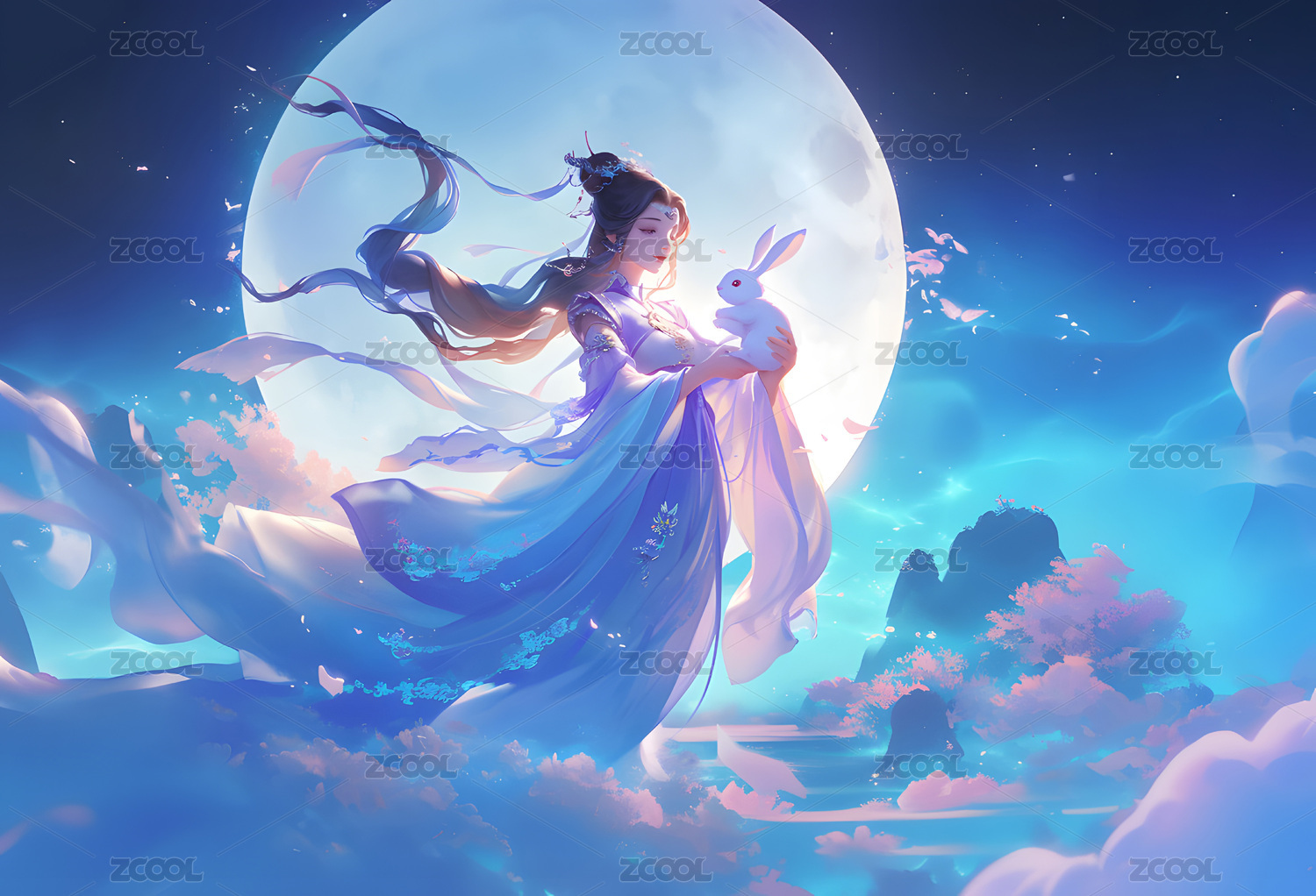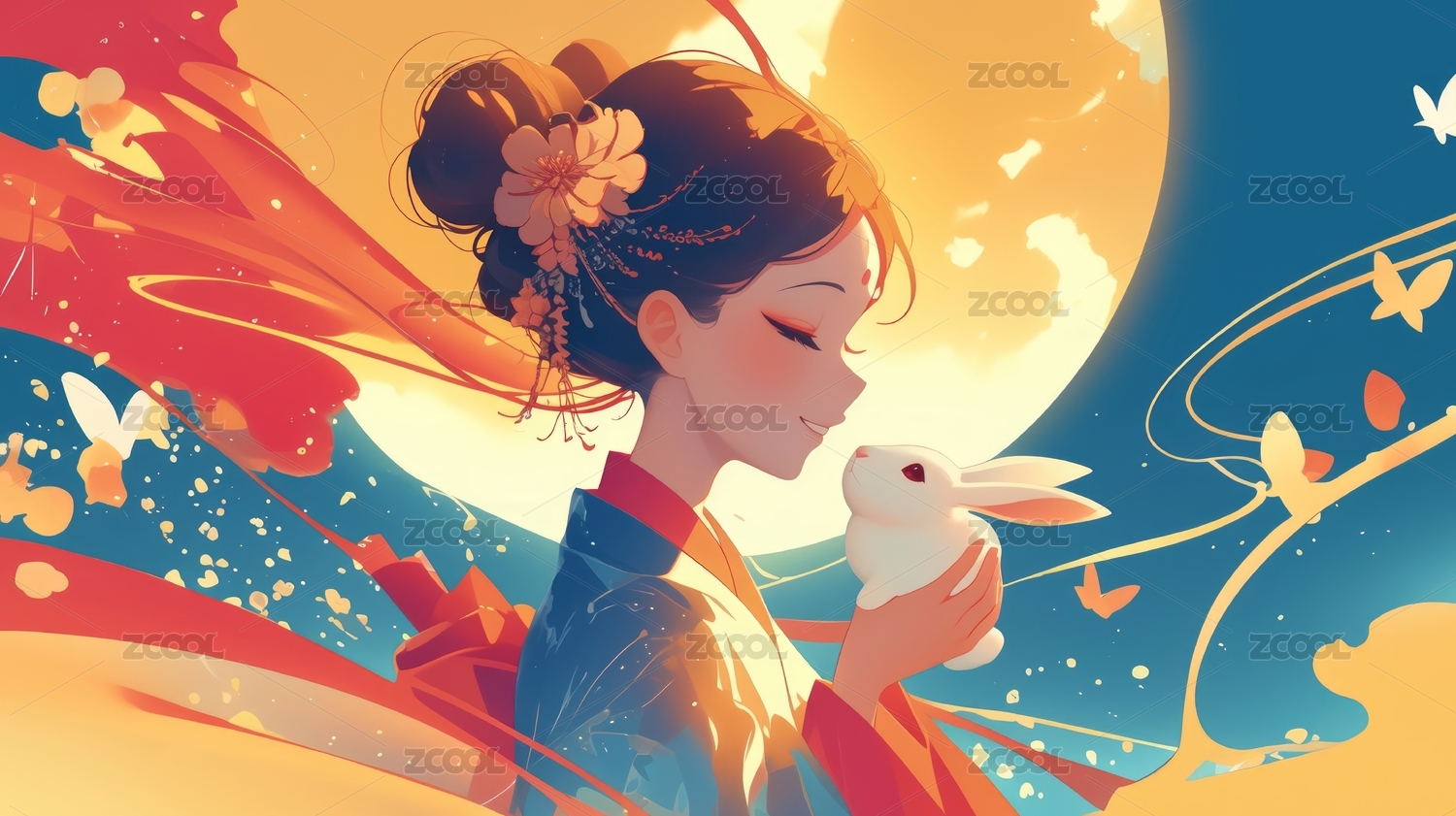 中秋节嫦娥玉兔月亮卡通漫画插画
