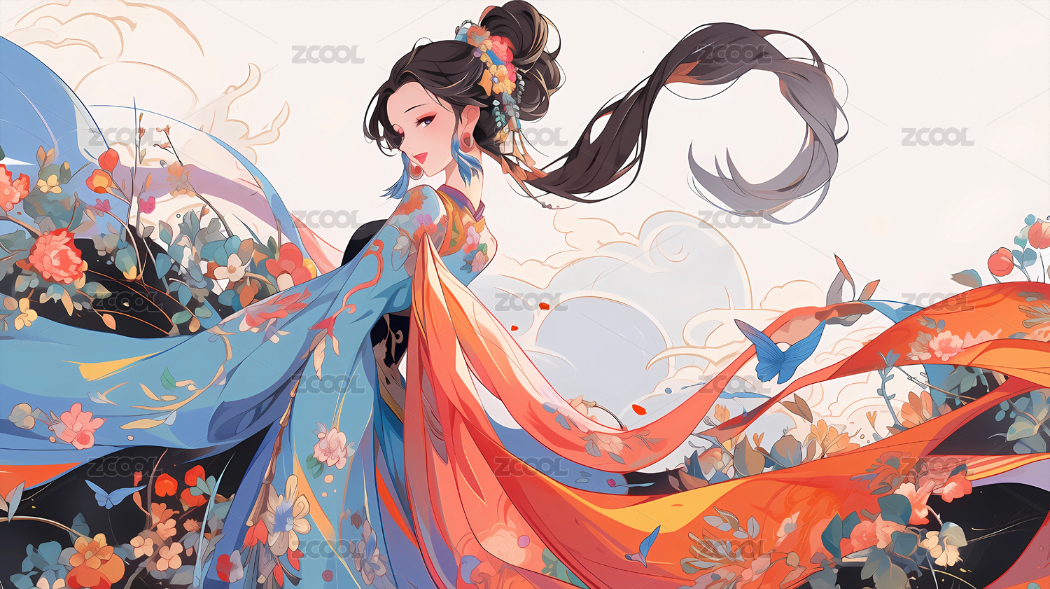 手绘卡通古风身穿传统服饰汉服漂亮女孩插画