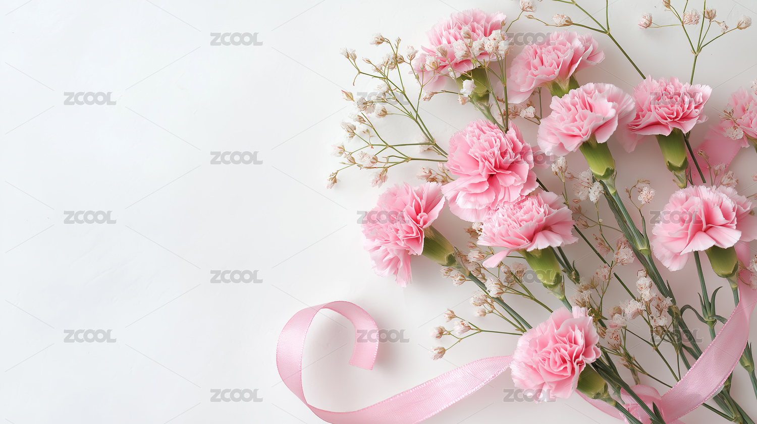 浅粉康乃馨配丝带白背景花艺摄影素材