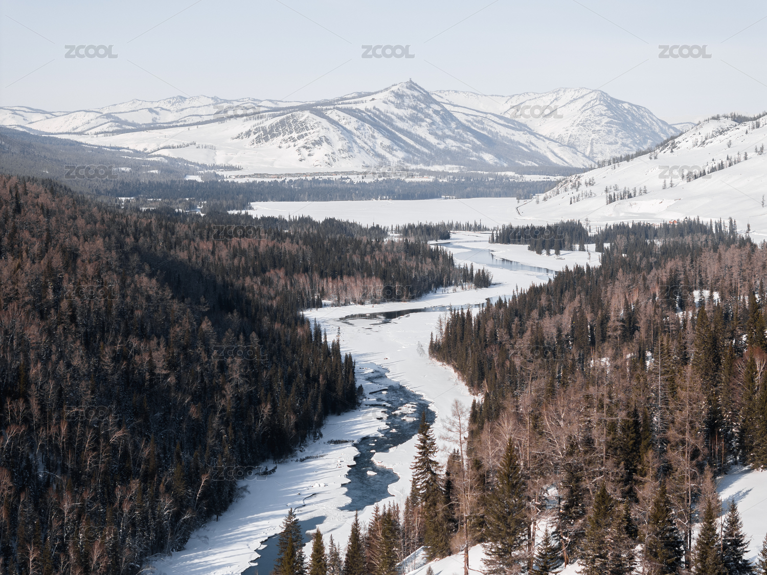 中国黑龙江第一湾冬天冰封雪堆的河流现象