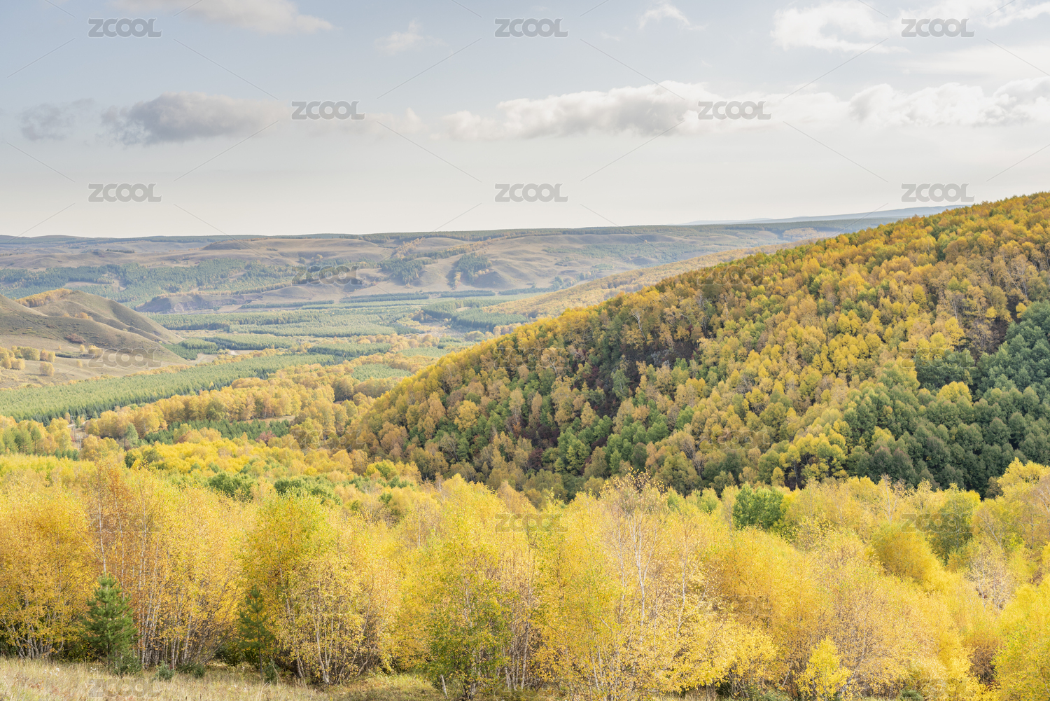 秋天内蒙古赤峰坝上草原十八盘的山坡和树林
