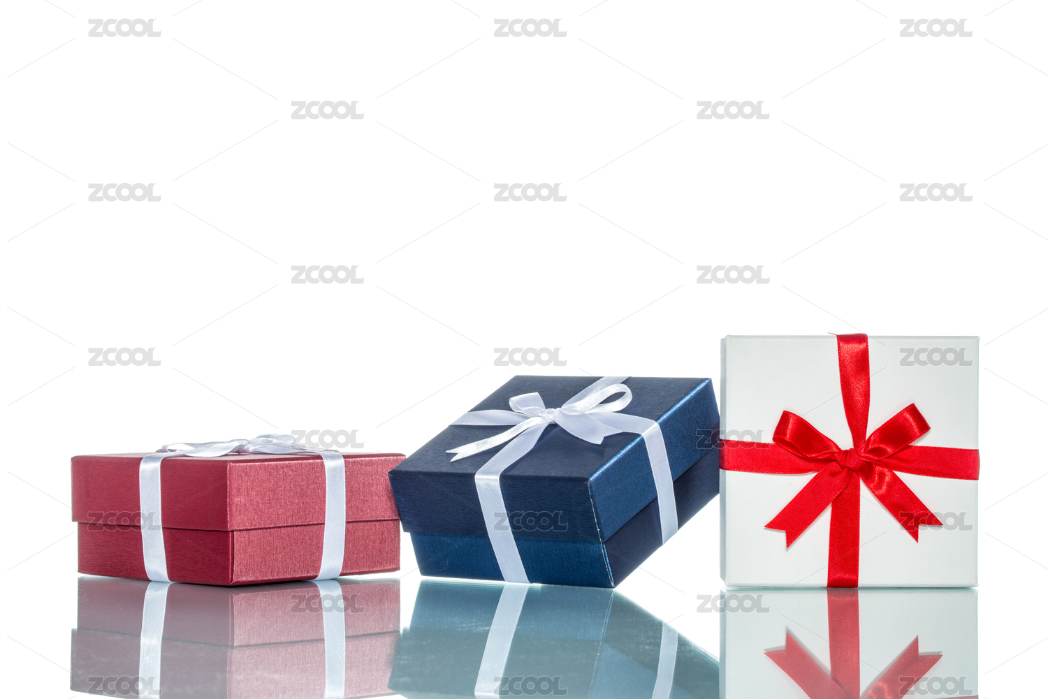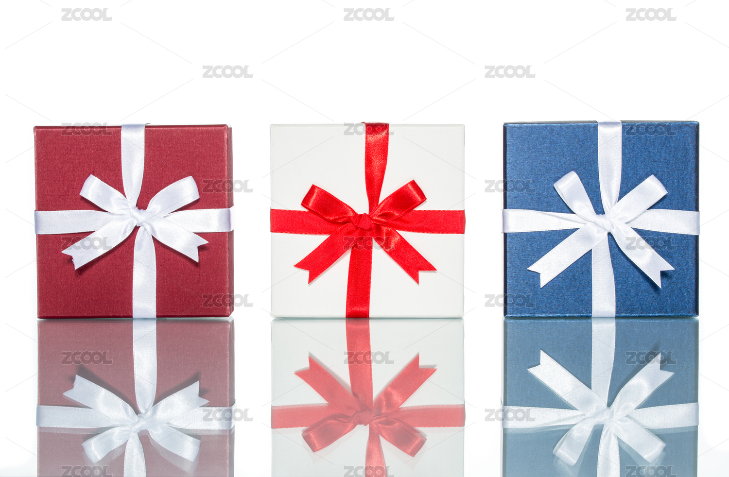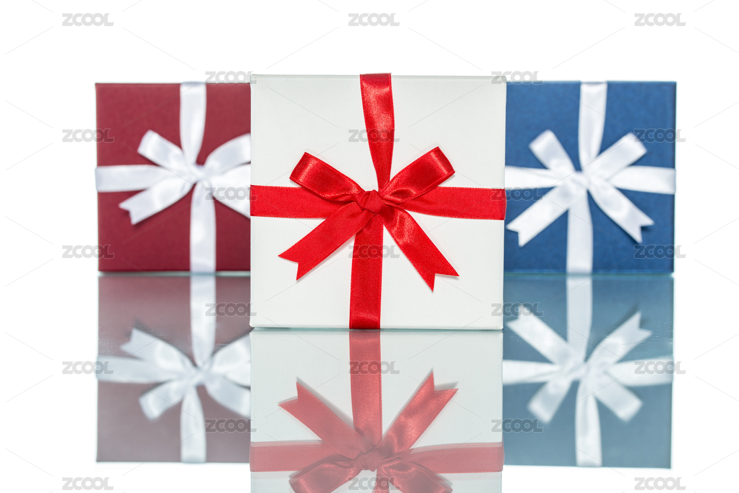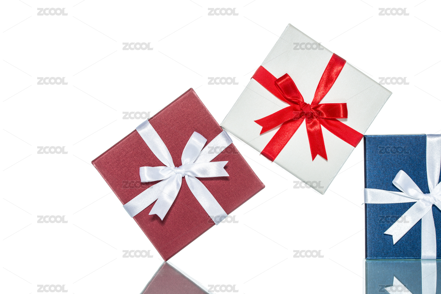 对于在白色背景孤立美丽绸包裹的节日事件奢华彩色礼品盒