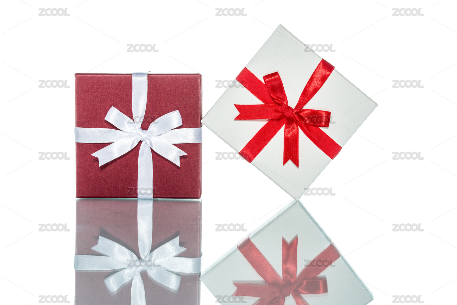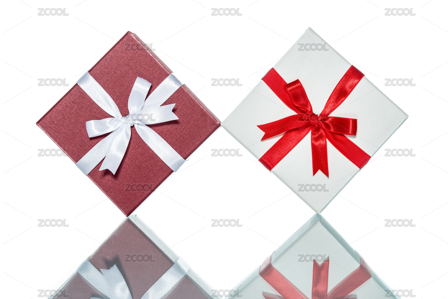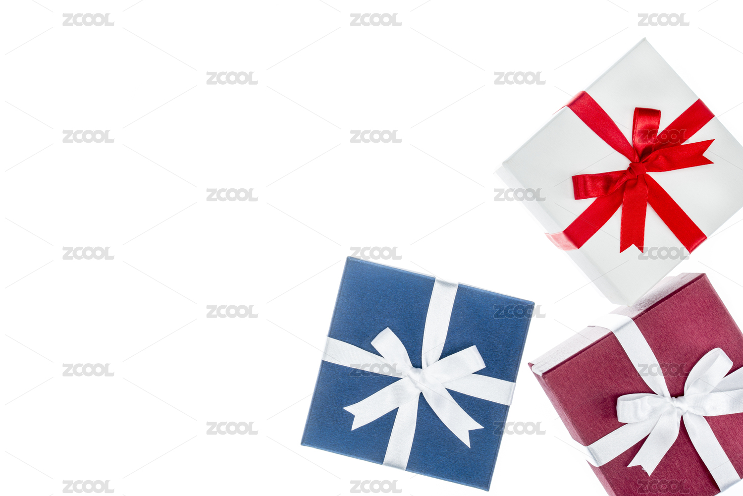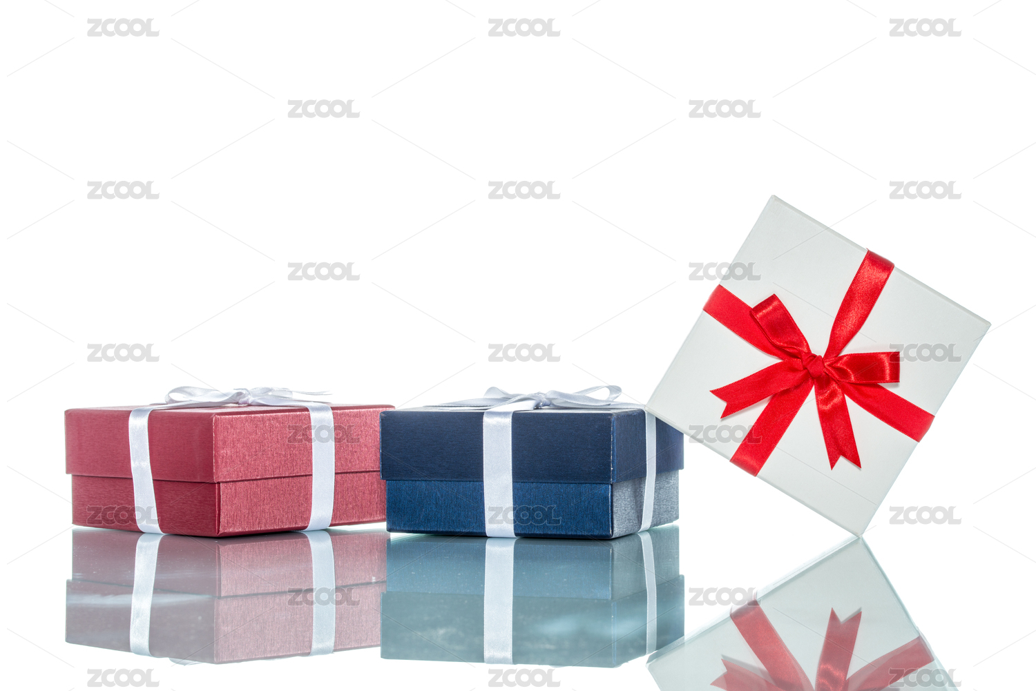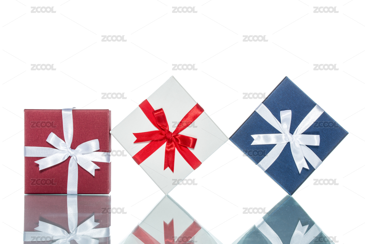 对于在白色背景孤立美丽绸包裹的节日事件奢华彩色礼品盒