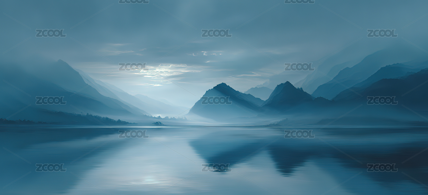 蓝色调水墨风山水画的插图背景