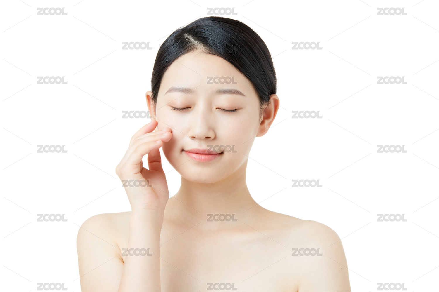 年轻的亚洲美女的微笑的女人触摸干净健康美丽的脸,在白色背景孤立