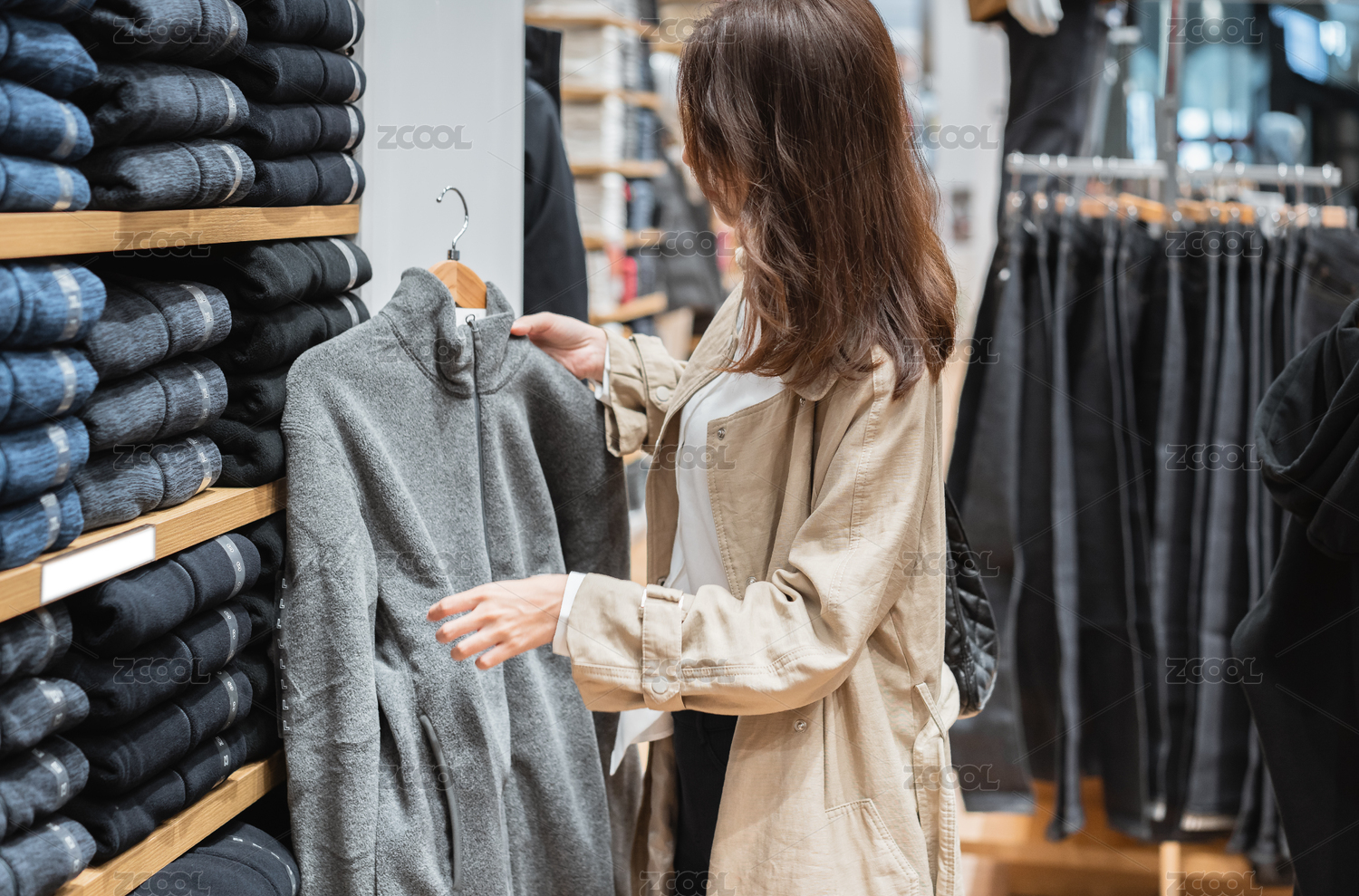 年轻都市女青年在服装店内选购冬季服装