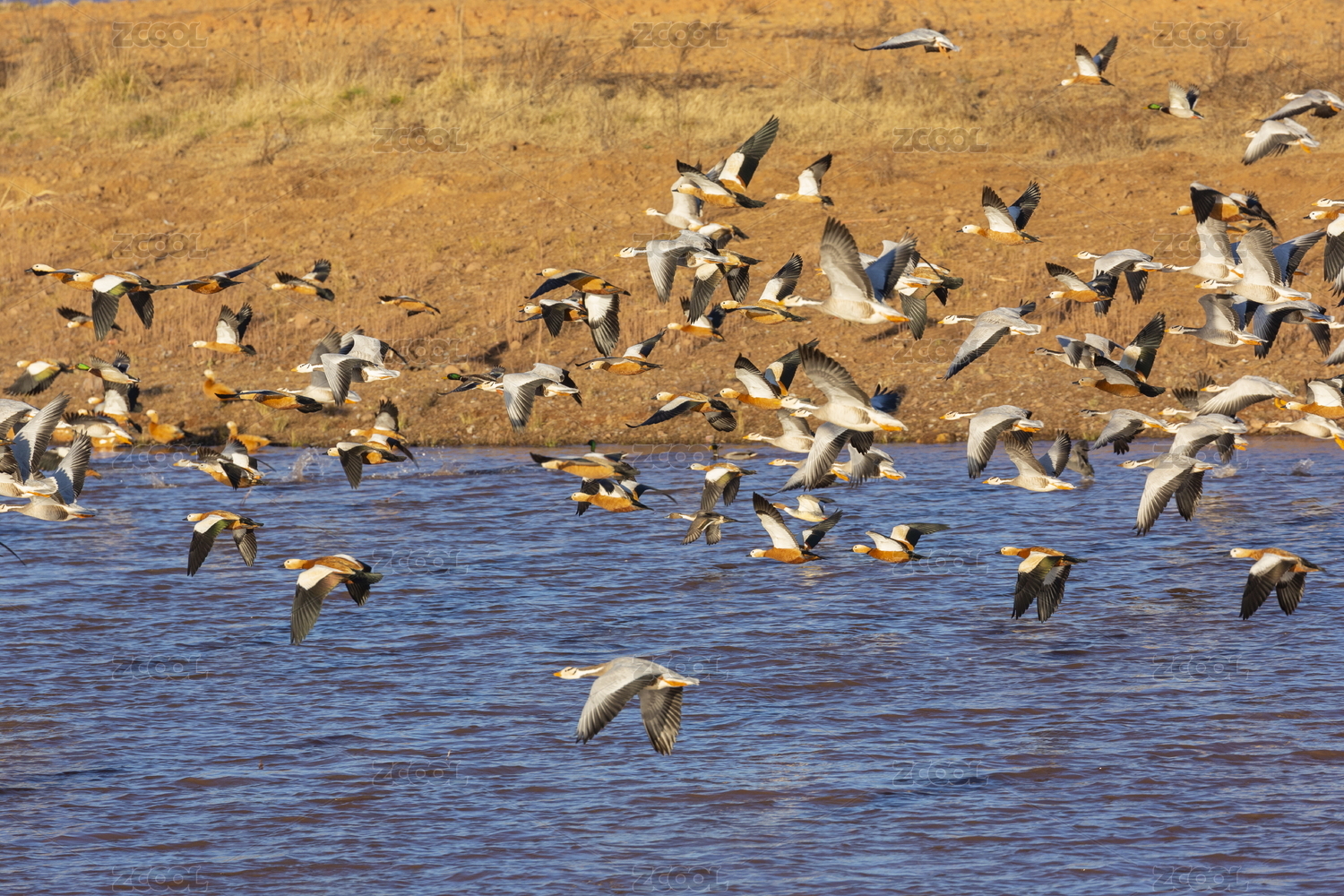 中国云南会泽念湖一群斑头雁赤麻鸭飞翔