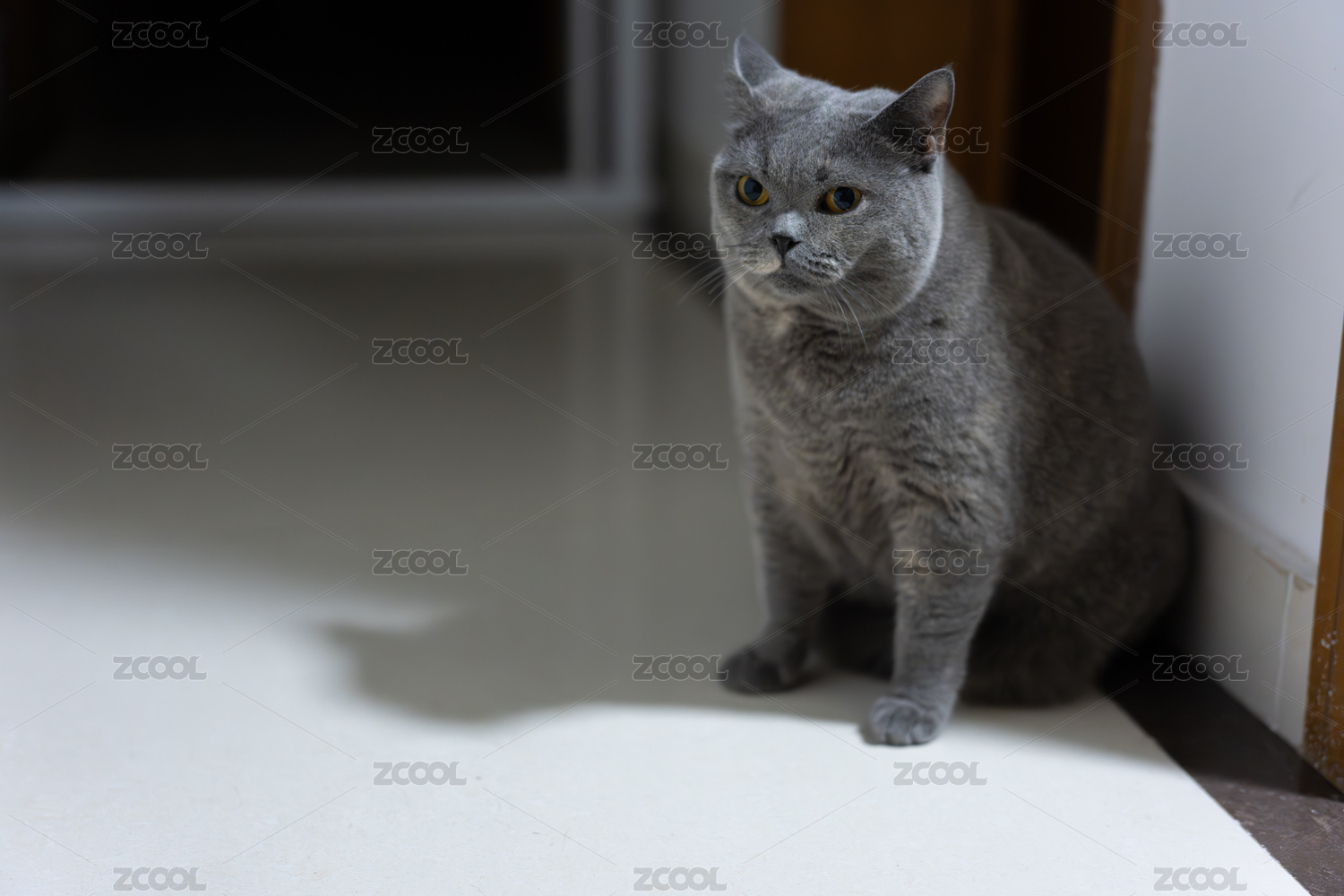 有些肥胖英国短毛猫舔完毛后看着周围的环境
