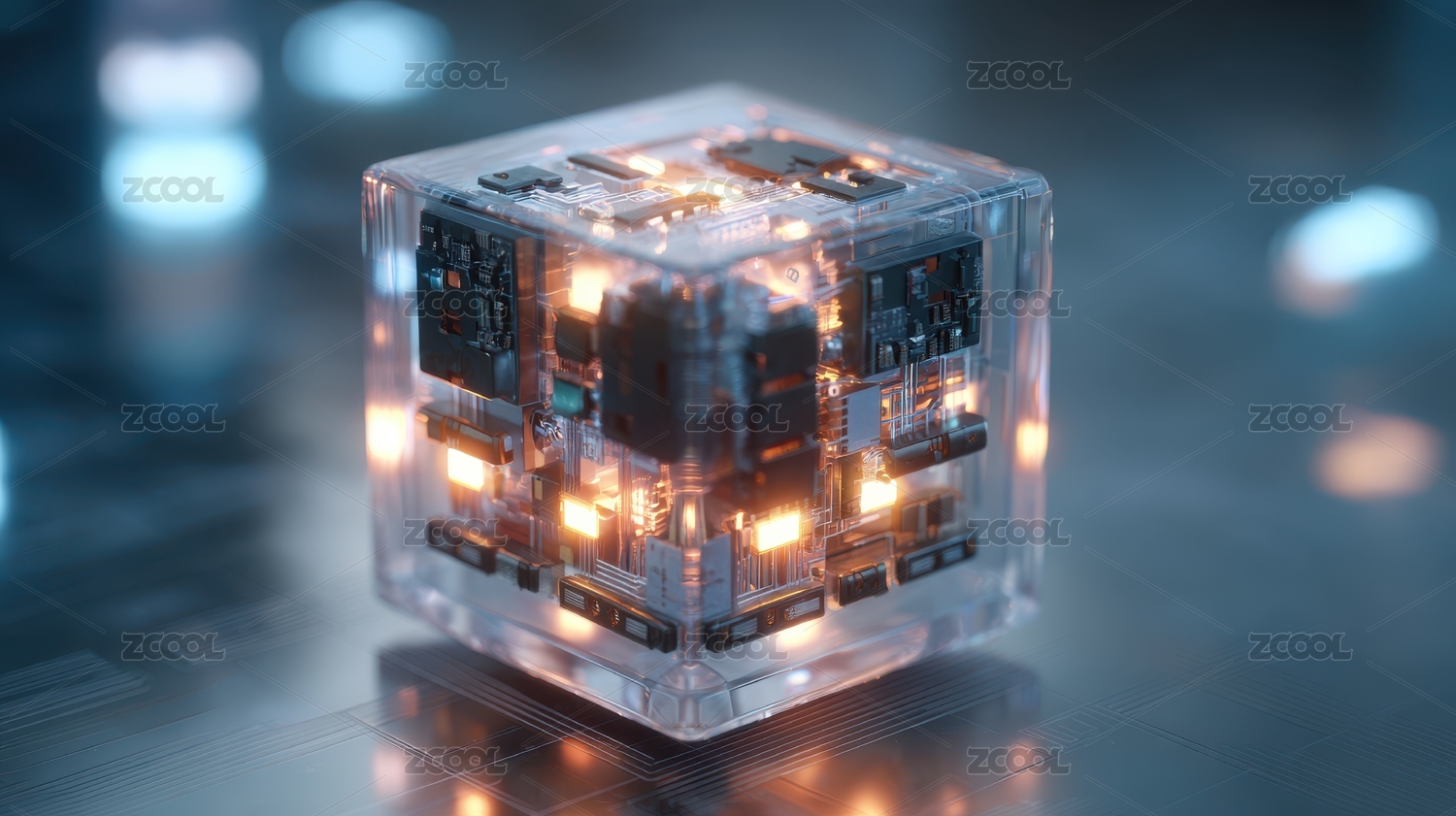 透明立方体内的电路板与灯光
