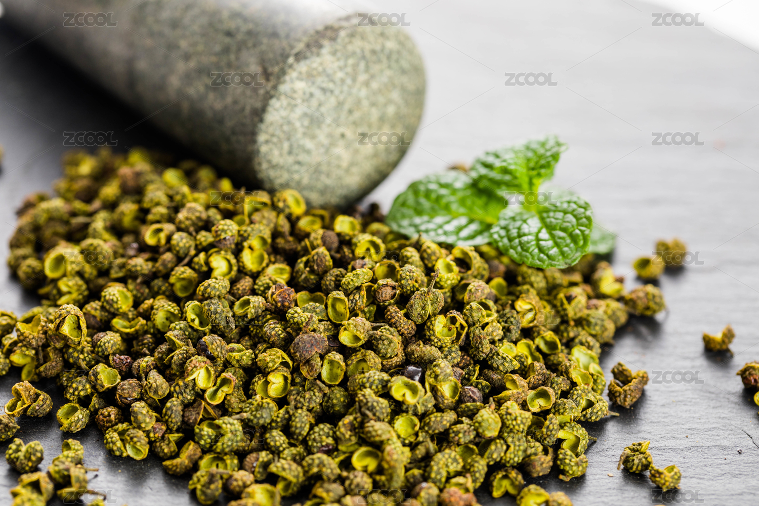 放在石板上的香料青花椒及碾磨石