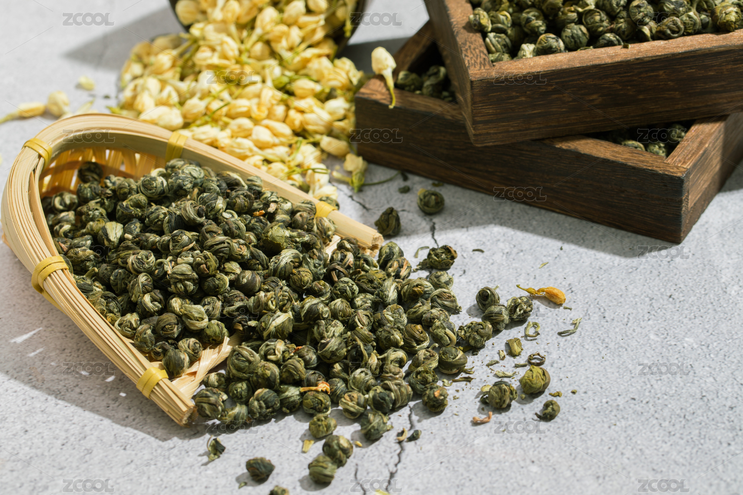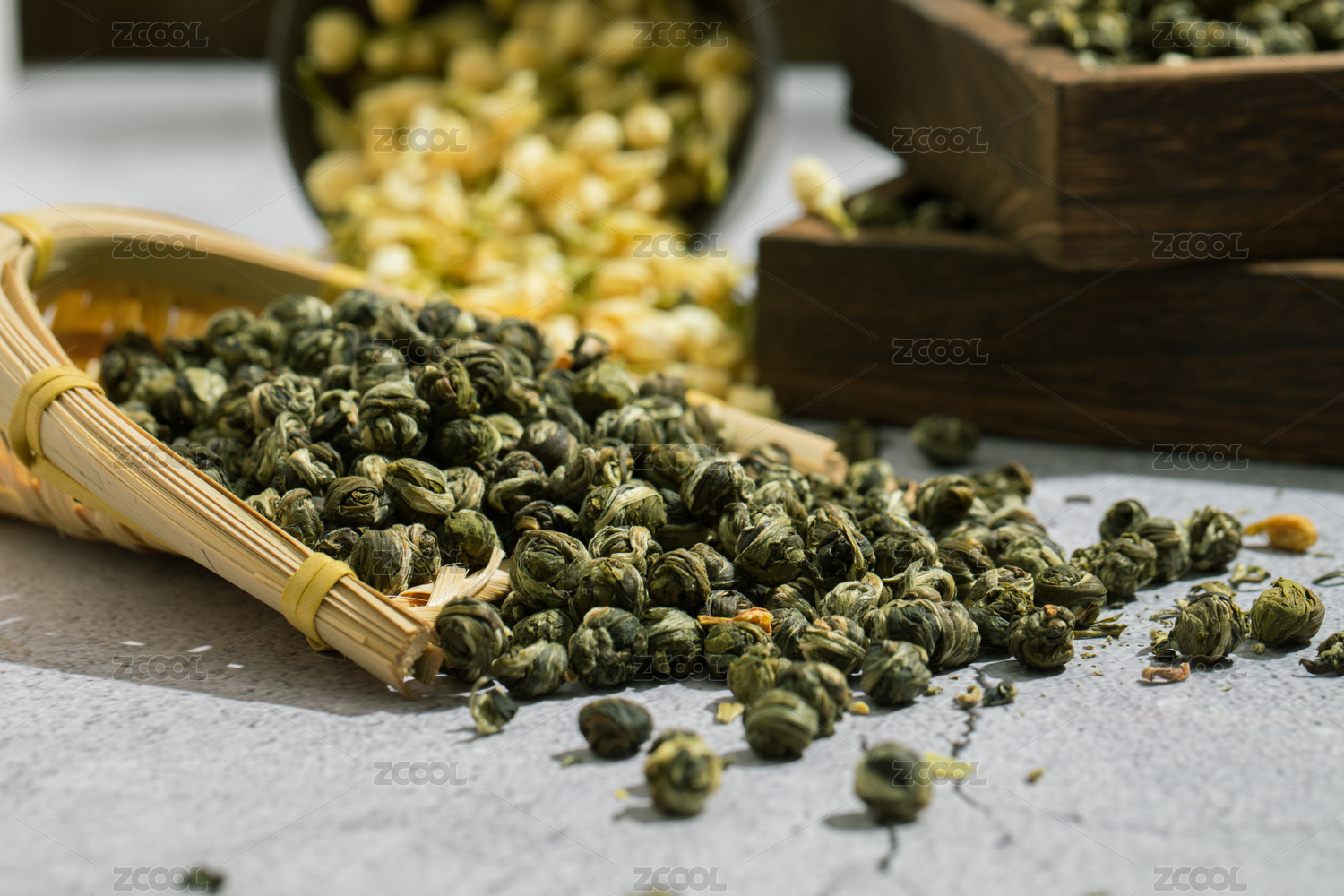 装竹簸箕里的茉莉龙珠干茶叶