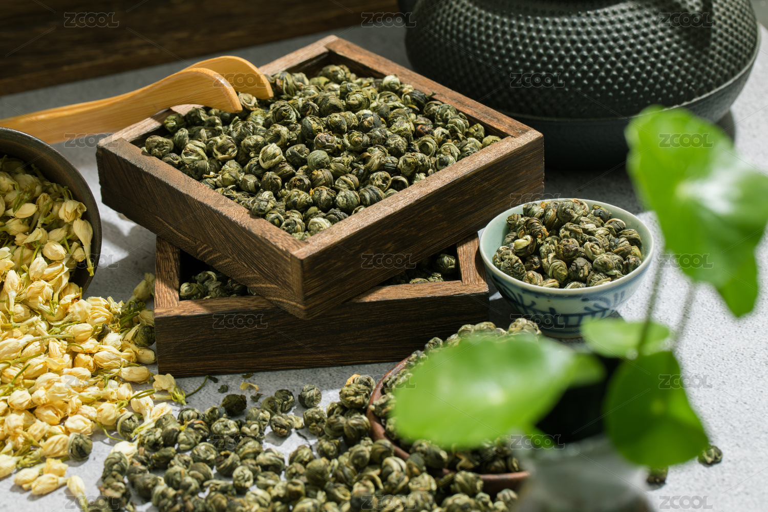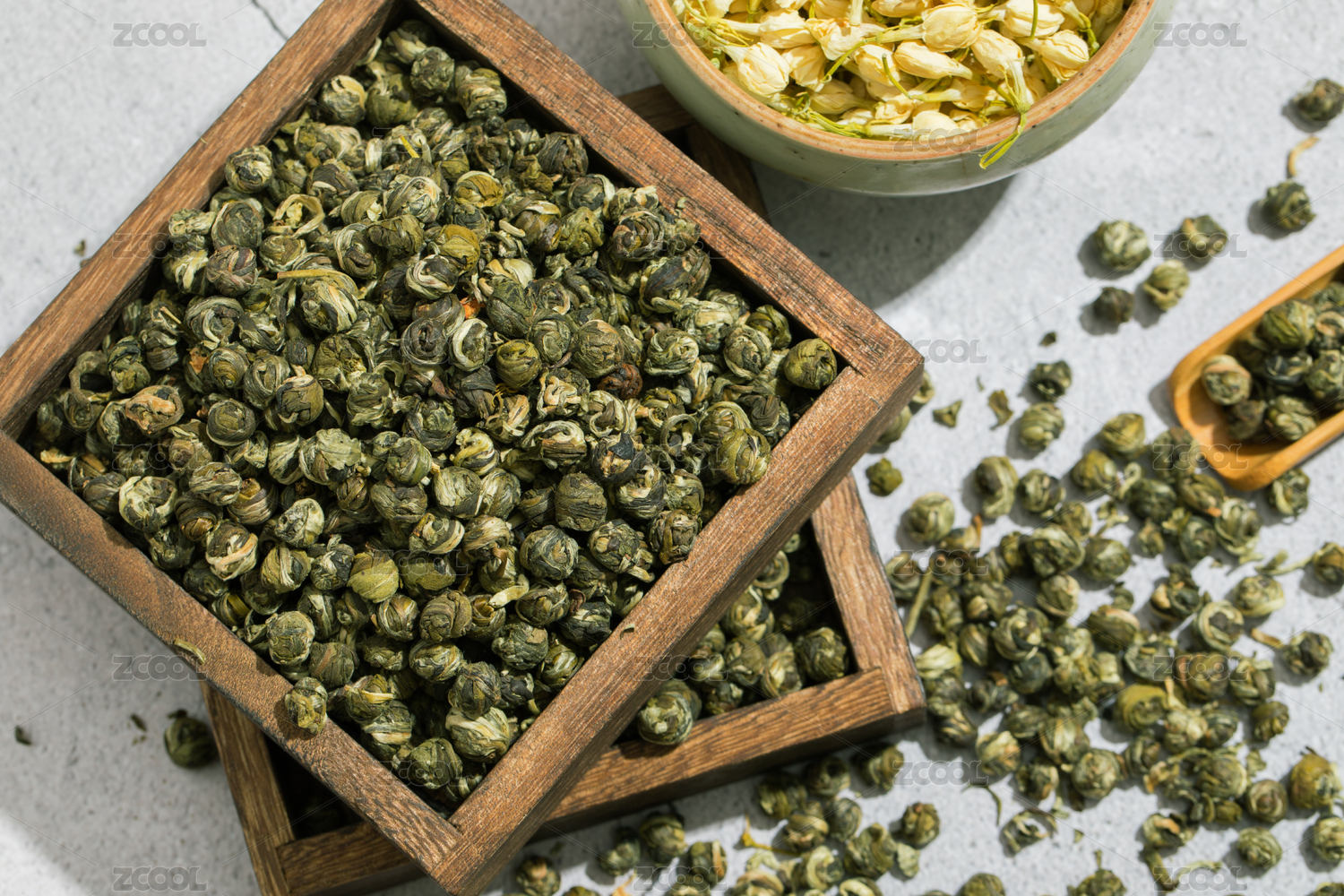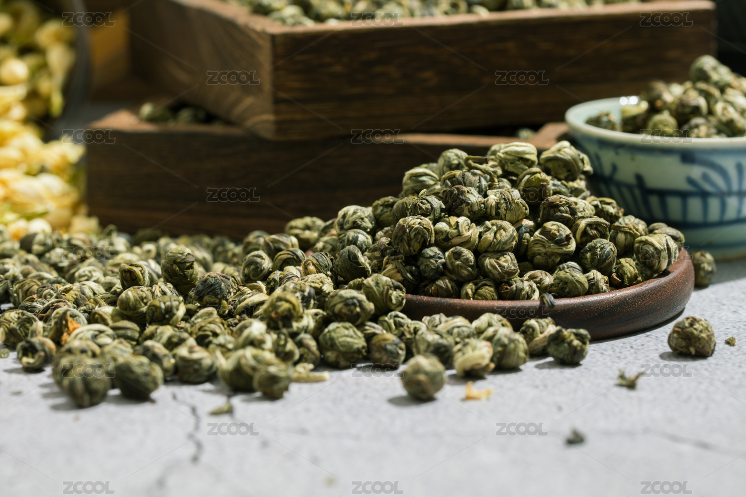 装在木碟里的茉莉龙珠干茶叶
