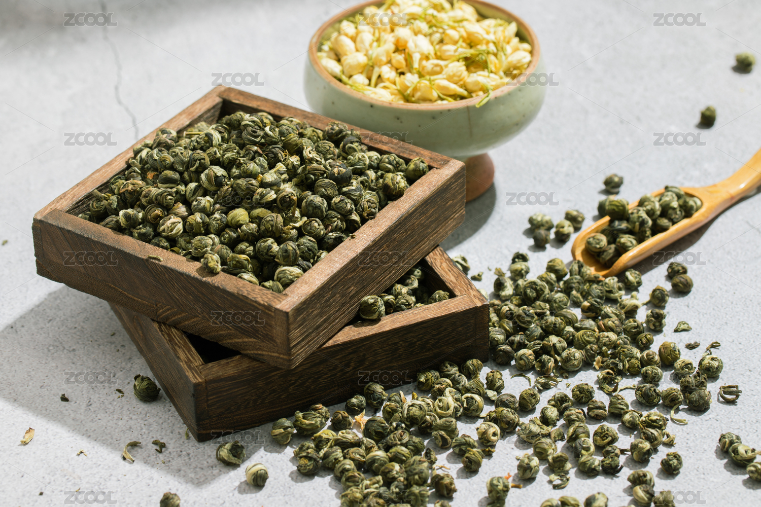 装在木盘里的茉莉龙珠干茶叶