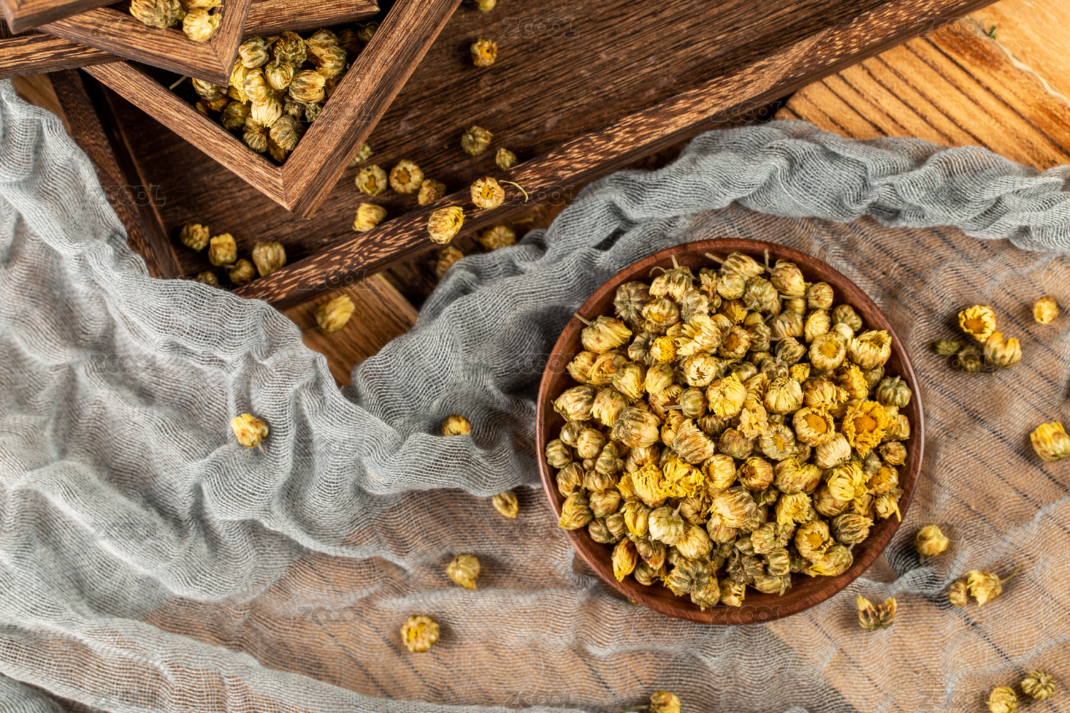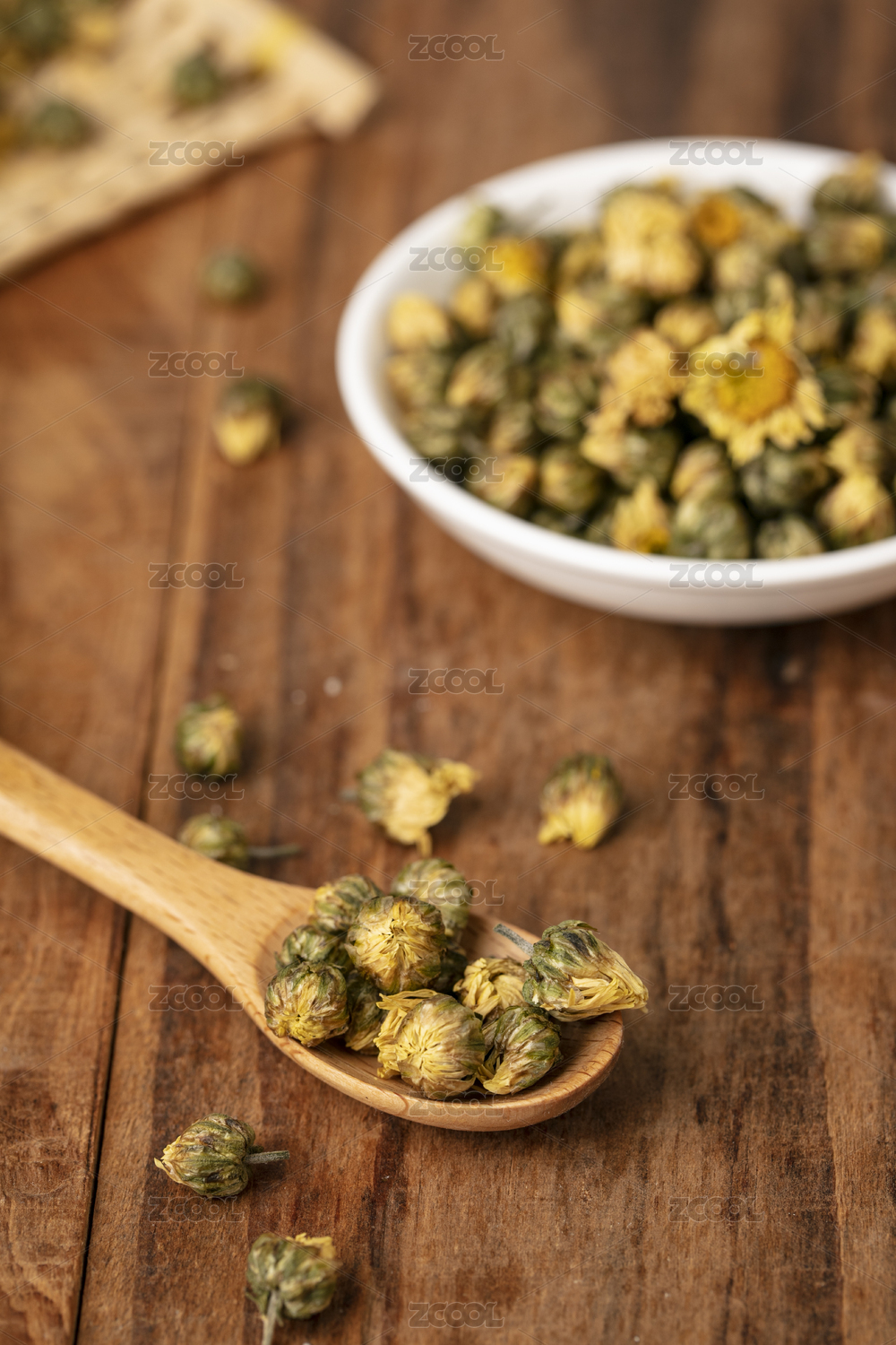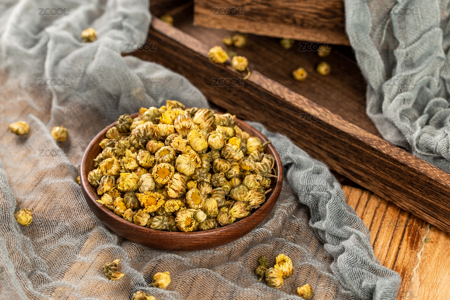 木板背景上满满一碗胎菊花