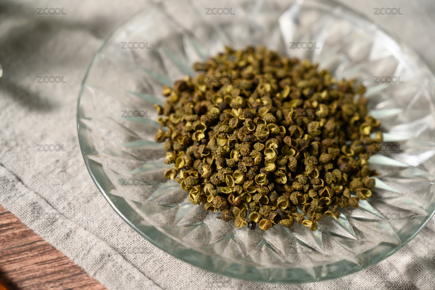 桌面上的盘子里的干爽的青花椒