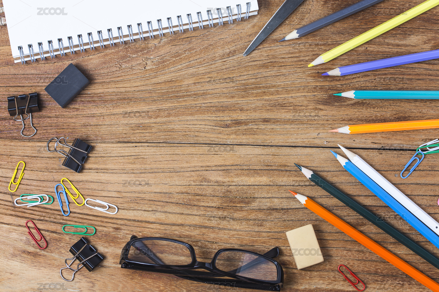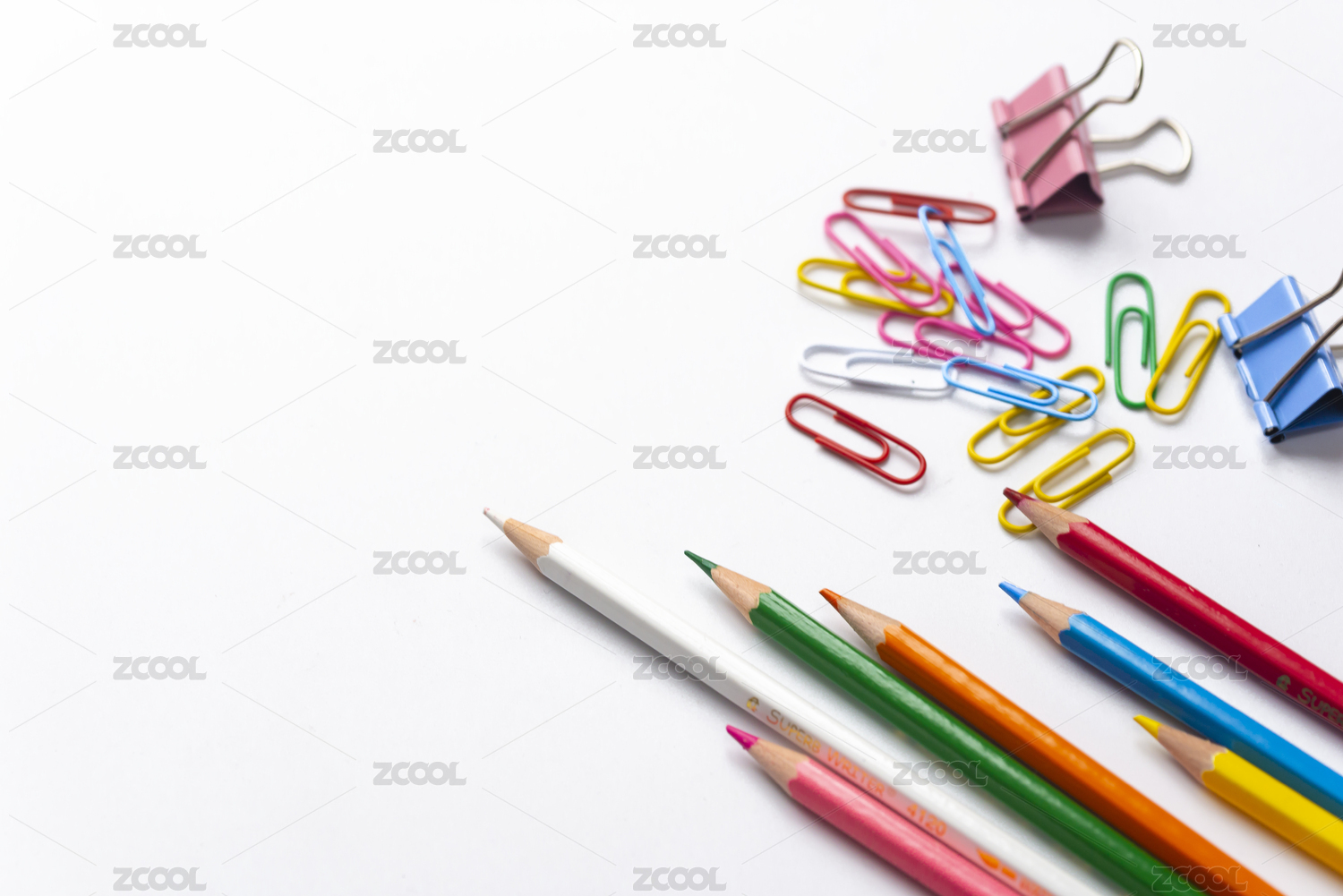 白底上随意散落的几根彩色铅笔回形针与票夹