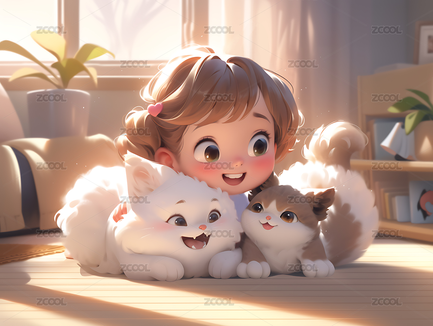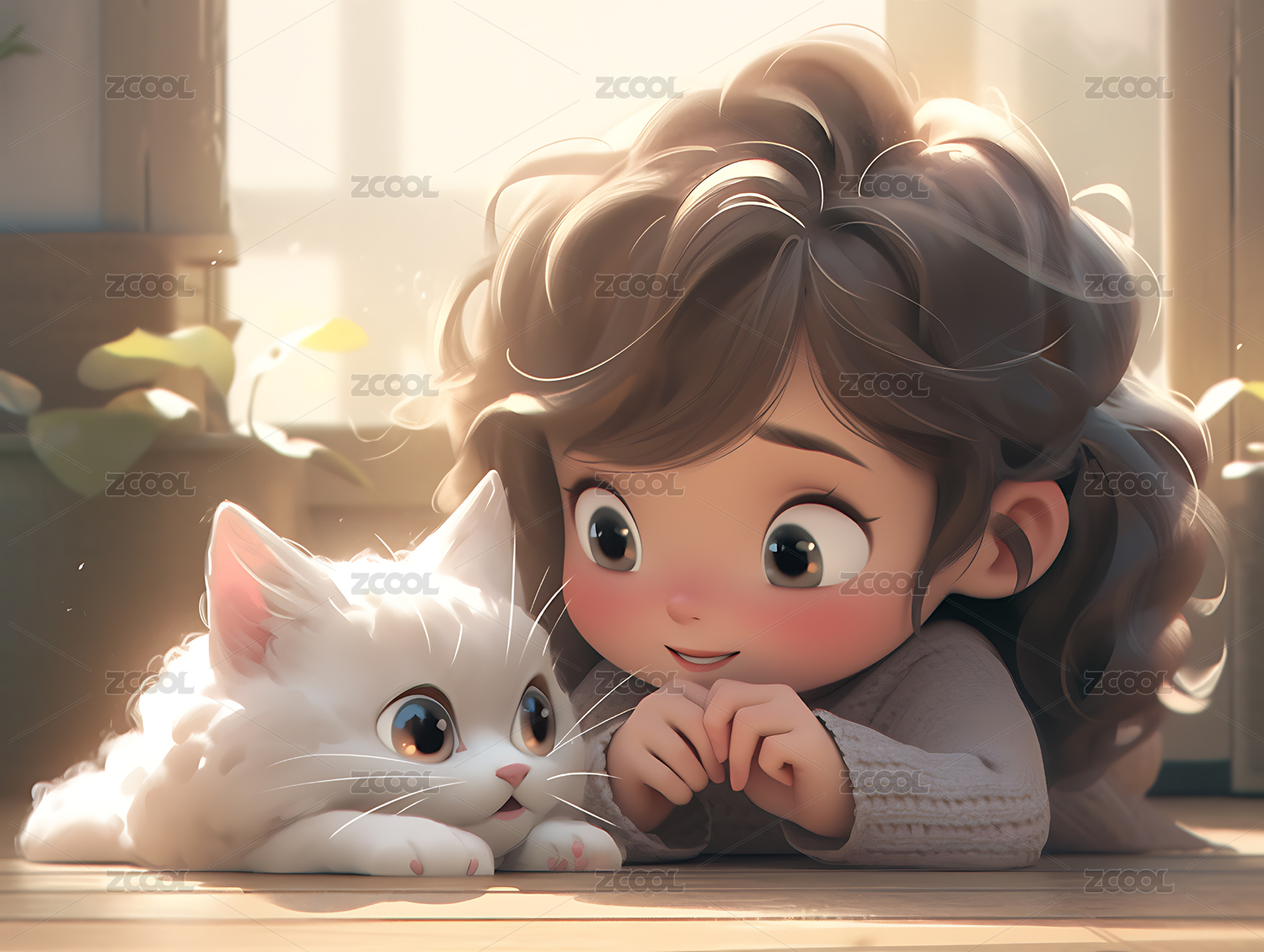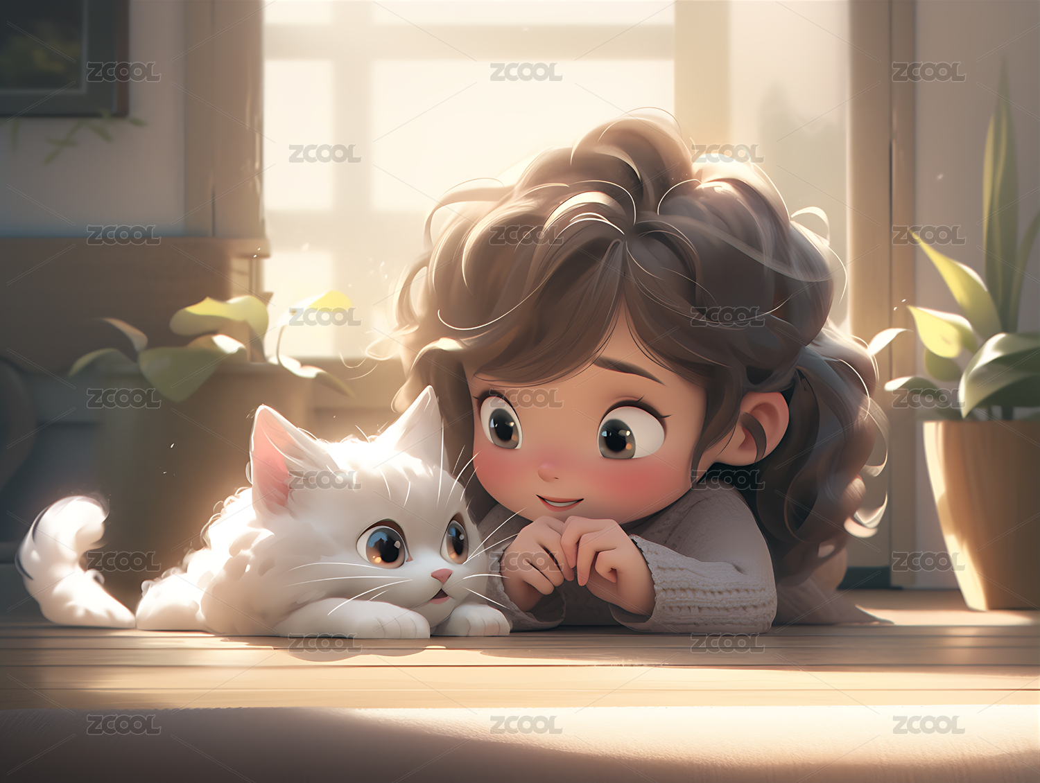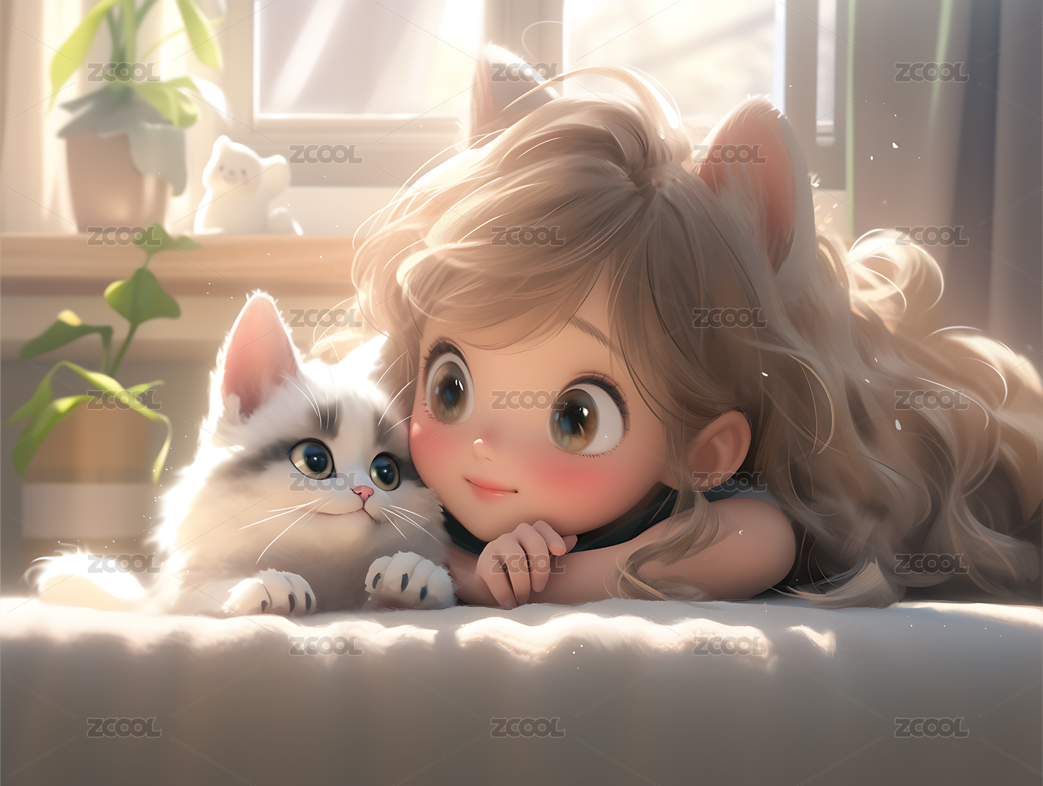 可爱风,AIGC202401,猫,女孩,阳光,卧室,治愈,温馨,宠物,猫咪