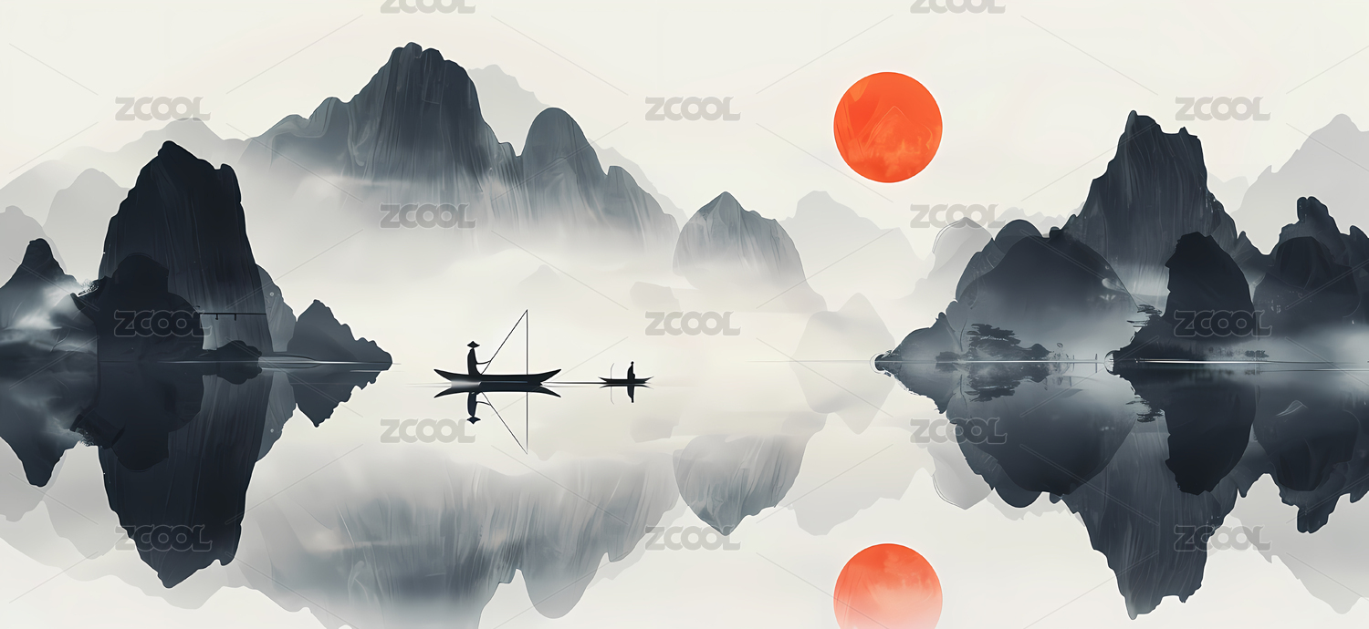 中国风,山水画,景色,水墨,背景,山水,渔船,湖泊,烟雾,群山