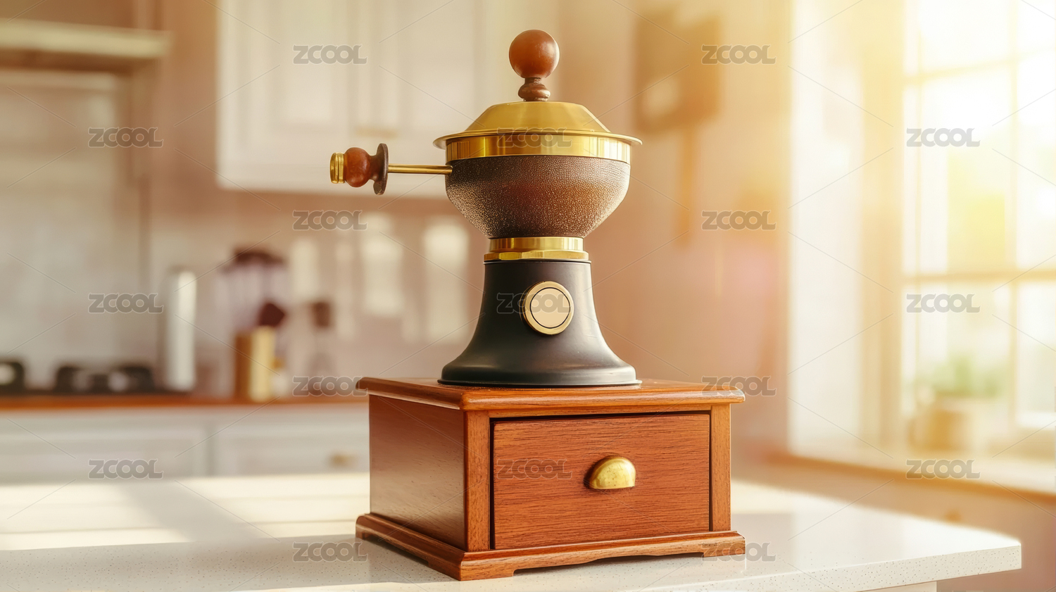 暖色背景木纹桌面上的手摇咖啡研磨机