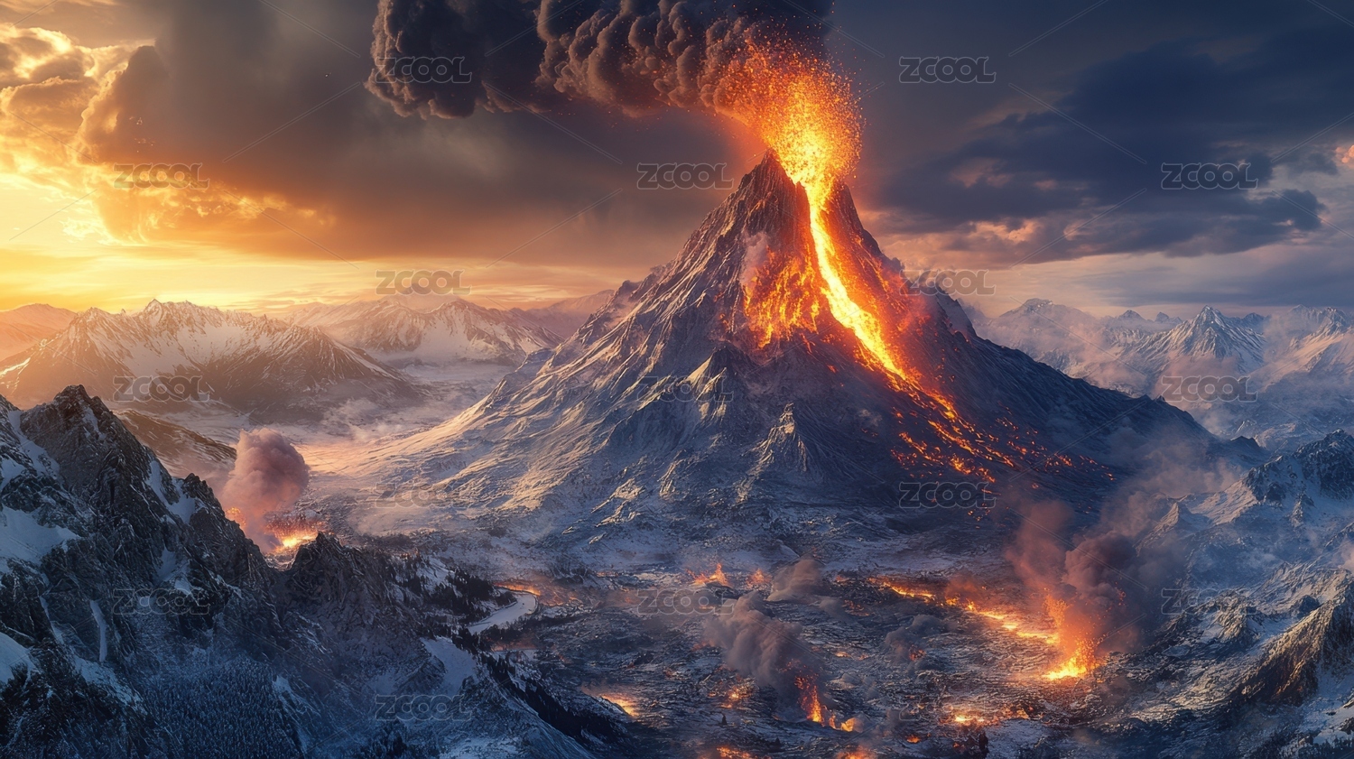 夕阳下的火山喷发