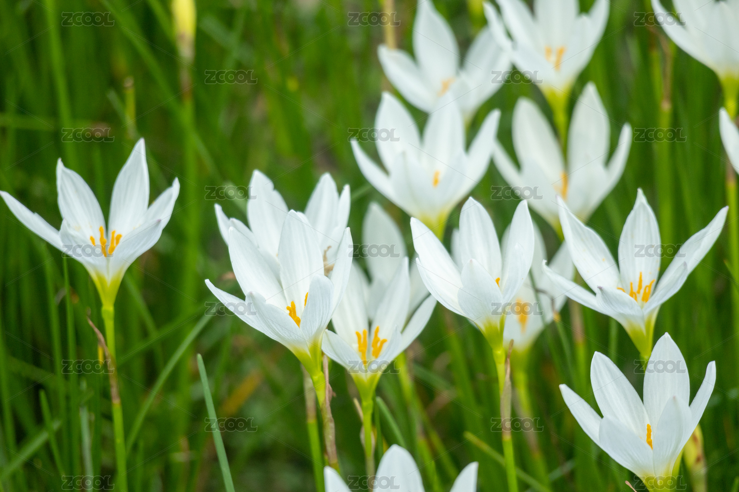 晴朗天气下土地上盛放着白色的葱莲鲜花草药
