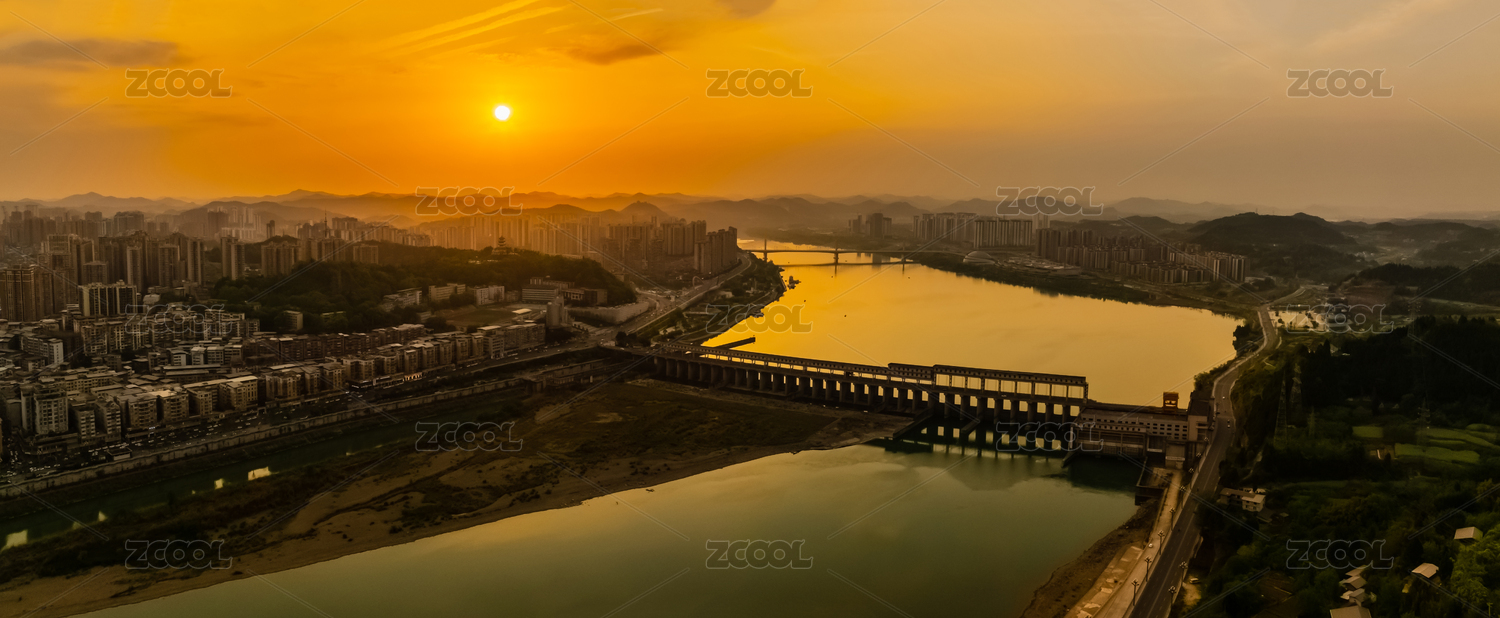 中国四川省南部县暮色朝阳嘉陵江外滩建筑