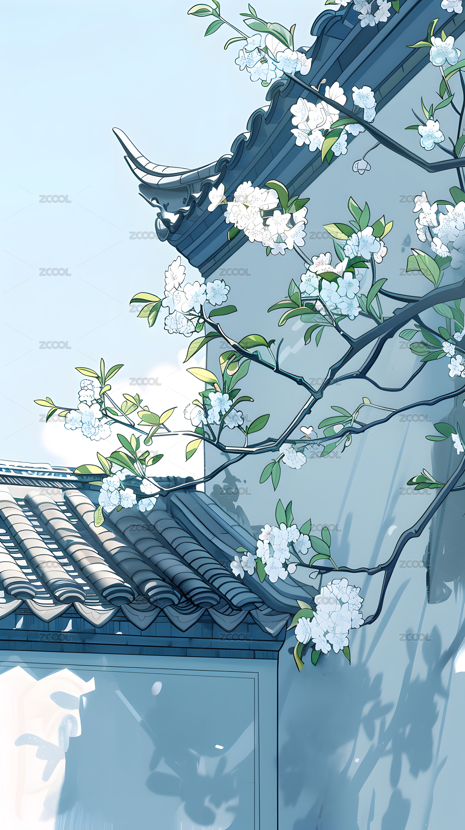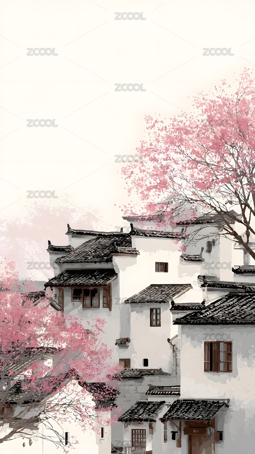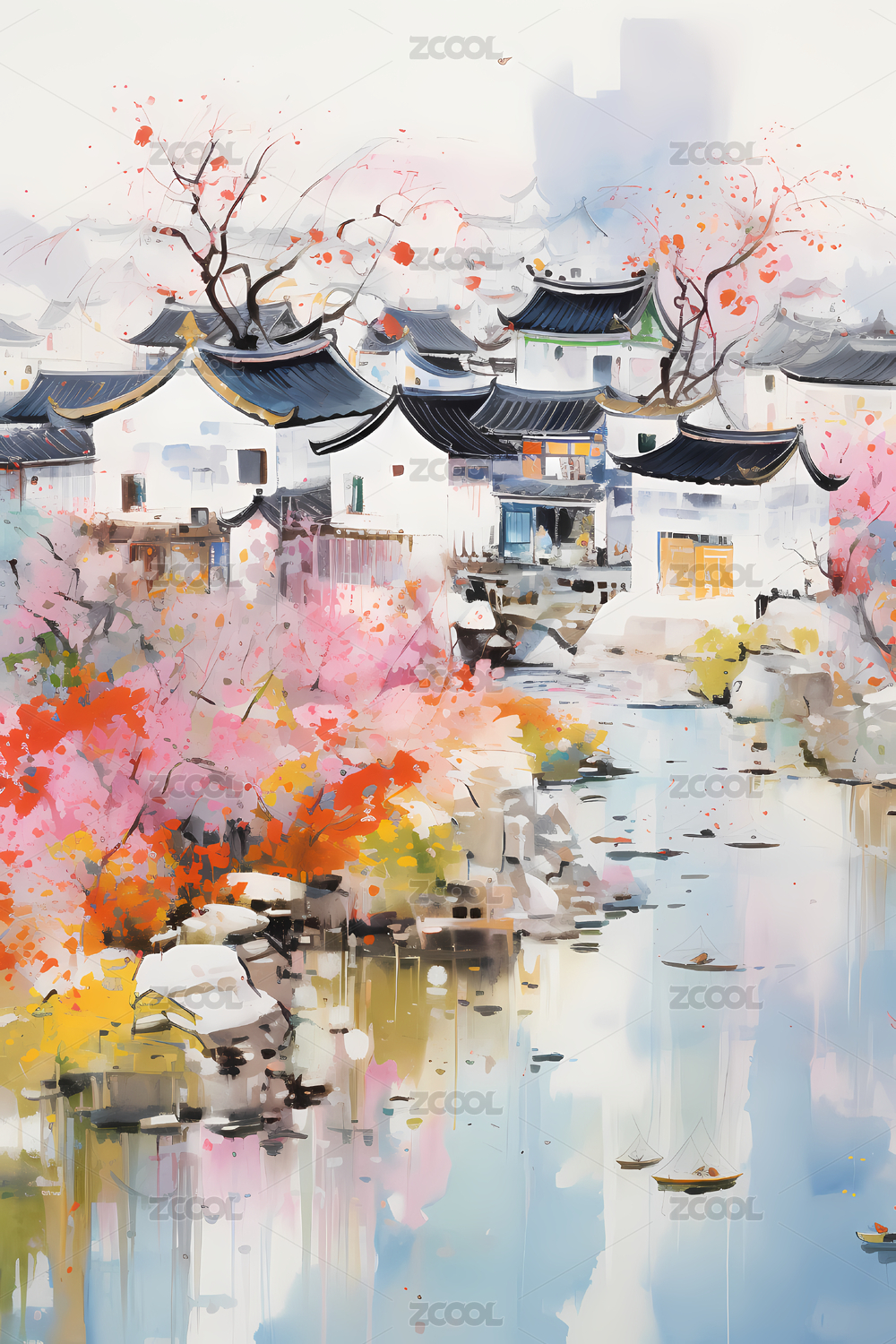 中国风,水墨,乡镇,小镇,城镇,腊梅,梨花,春天,白色,花朵