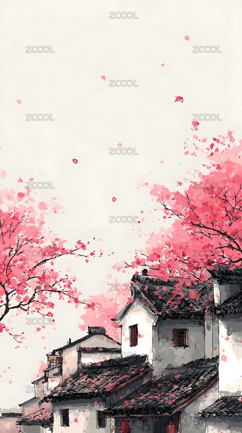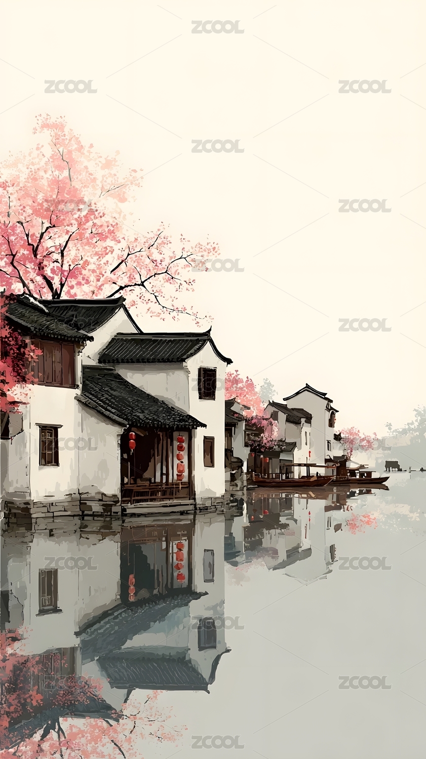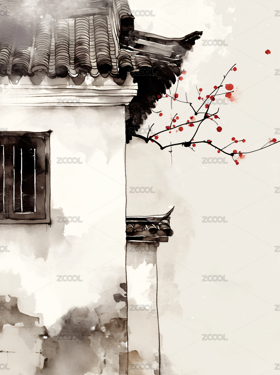 中国风,水墨,乡镇,小镇,城镇,腊梅,梨花,春天,白色,花朵