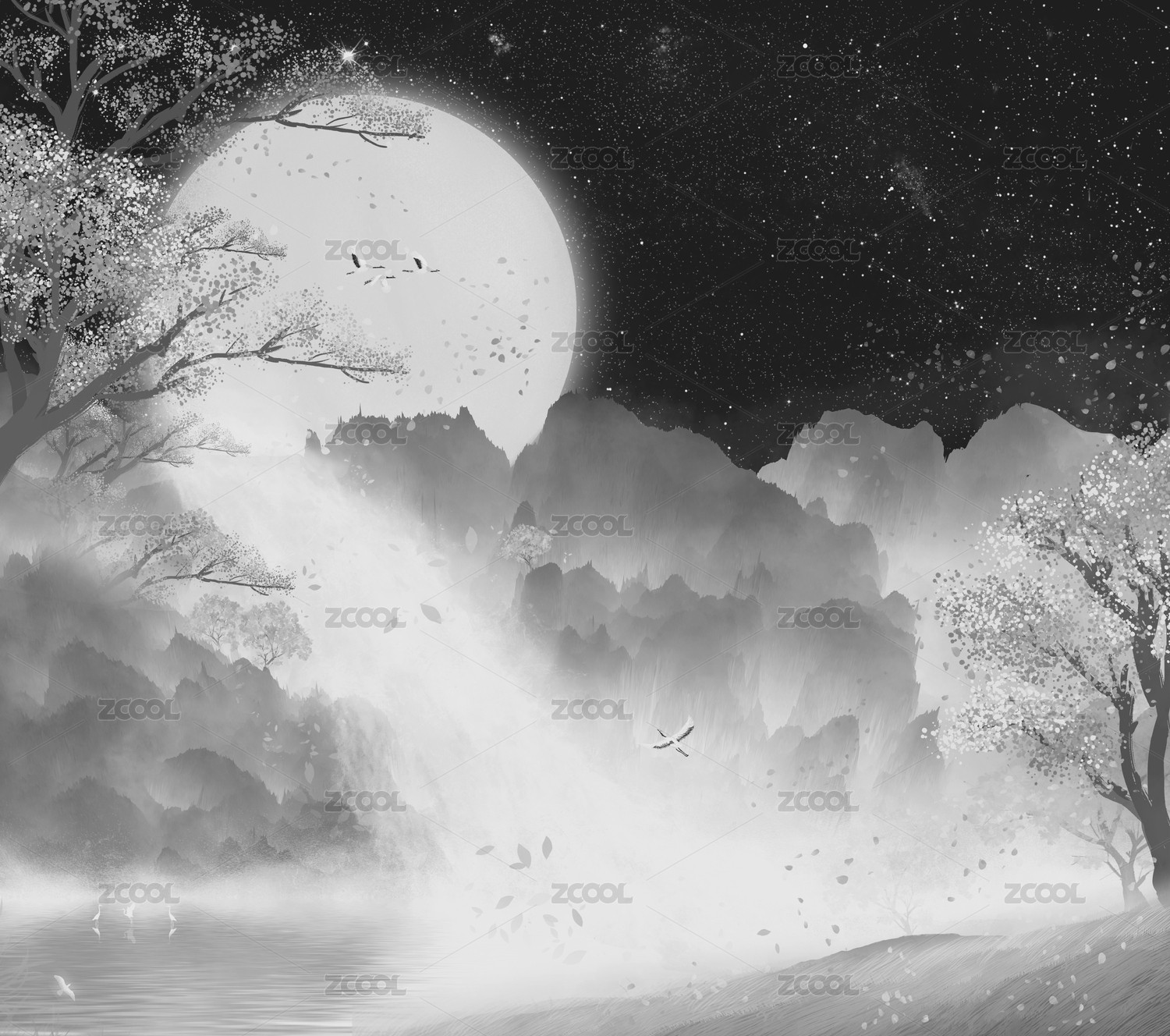 夜晚月光下白色花瓣的树 水墨风白月光插画场景
