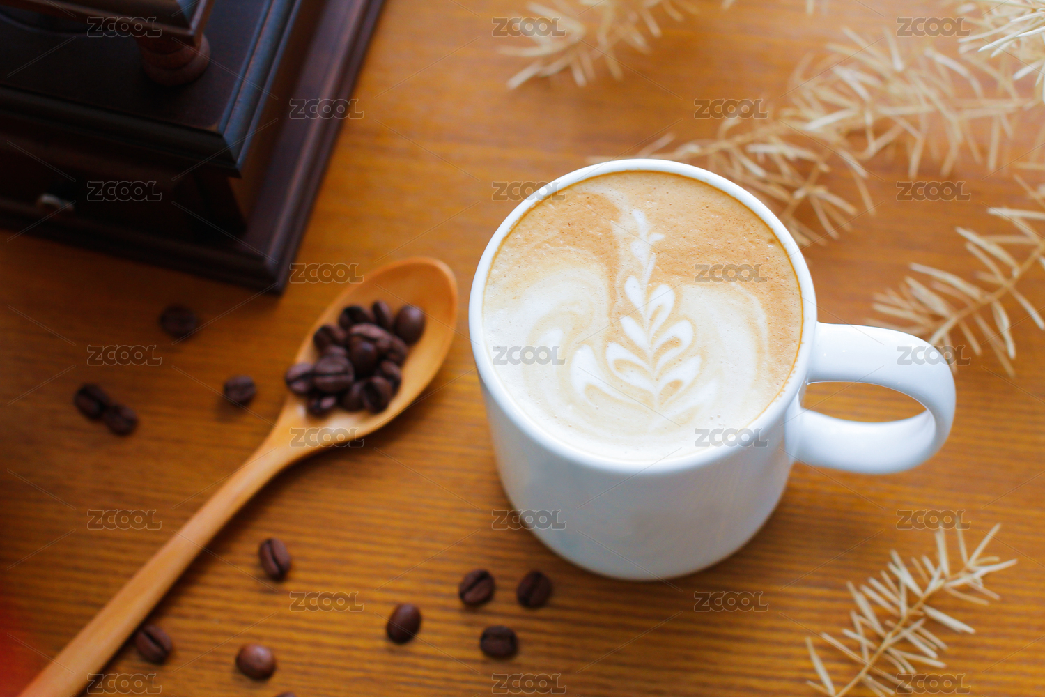 大理石纹杯子装的拿铁咖啡放木桌子上
